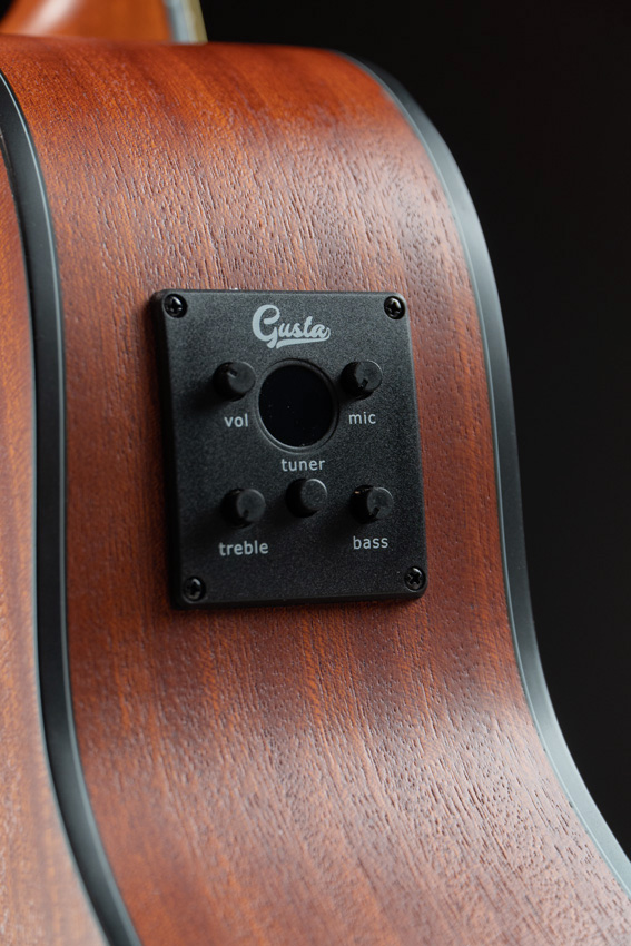 Gusta OM1CE กีต้าร์โปร่งไฟฟ้าที่เหมาะกับผู้เริ่มต้นในราคาประหยัด หรือคนที่มองหากีต้าร์ราคาย่อมเยาใช้งาน รุ่นนี้จะเป็นทรง OM ที่เหมาะสำหรับคนตัวเล็กหรือผู้หญิง โดยขนาดกีต้าร์จะเป็น 40 นิ้ว เล็กกว่าทรงเดรทน็อตเล็กน้อย ไม้บอดี้ทั้งหมดจะเป็นไม้ซาปีลี เป็นไม้ในตระกูลมะฮอกกานีที่นิยมปลูกในแอฟริกา ให้โทนเสียงคบทั้งย่านกลางย่านเบส ตีคอร์ดได้ฟิงเกอร์สไตล์ดี และมีการปรับปรุงภาคไฟฟ้าใหม่เป็นของทาง Gusta เอง เสียงมีมิติและจูนเนอร์แม่นยำขึ้นกว่ารุ่นก่อน สามารถปรับ EQ เสียงสูงและเสียงเบสได้เพื่อเลือกซาวด์ให้ได้ดังใจ งานนี้บอกได้คำเดียวว่าคุ้มค่าน่าสอยมาก