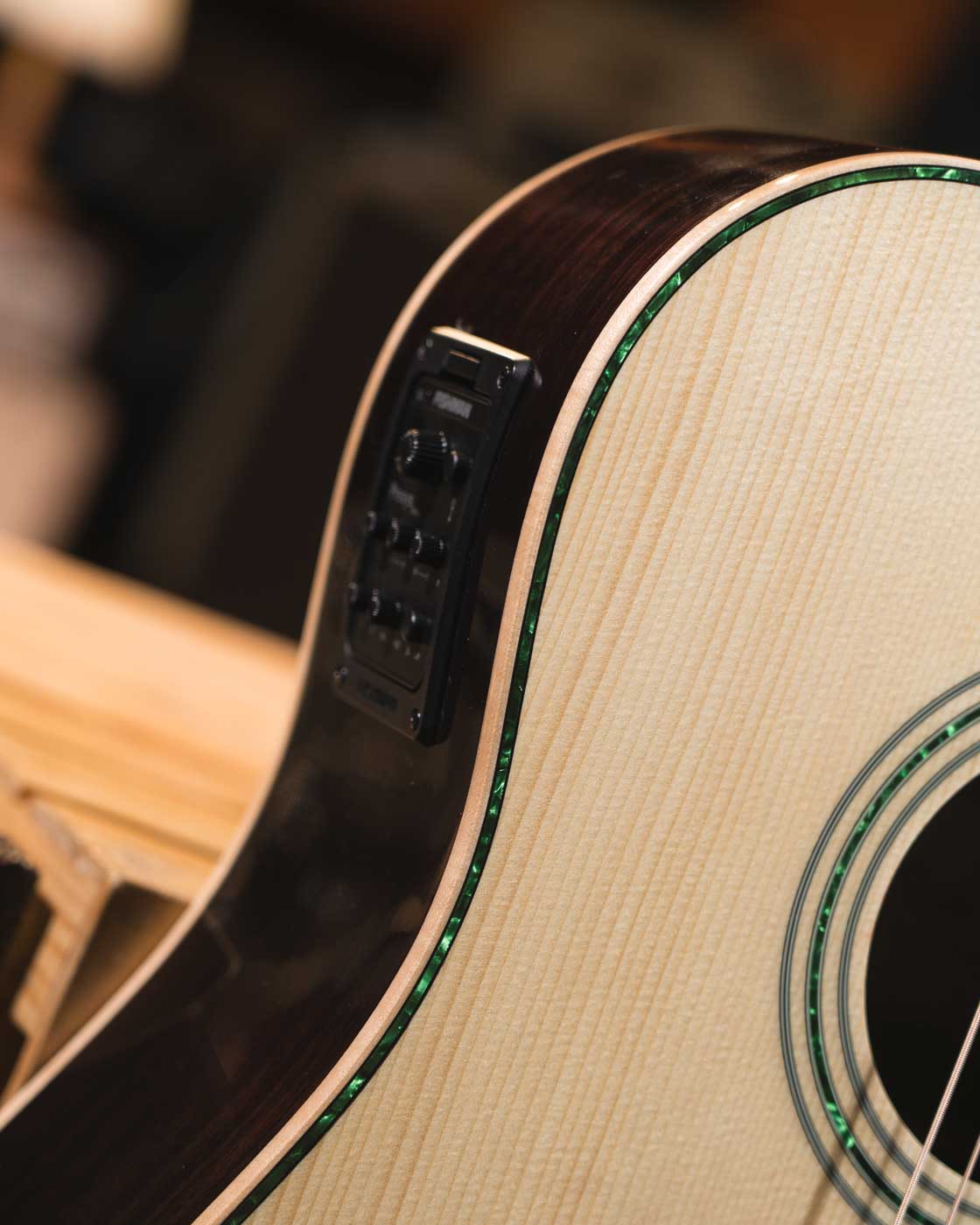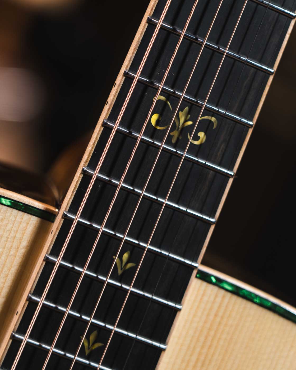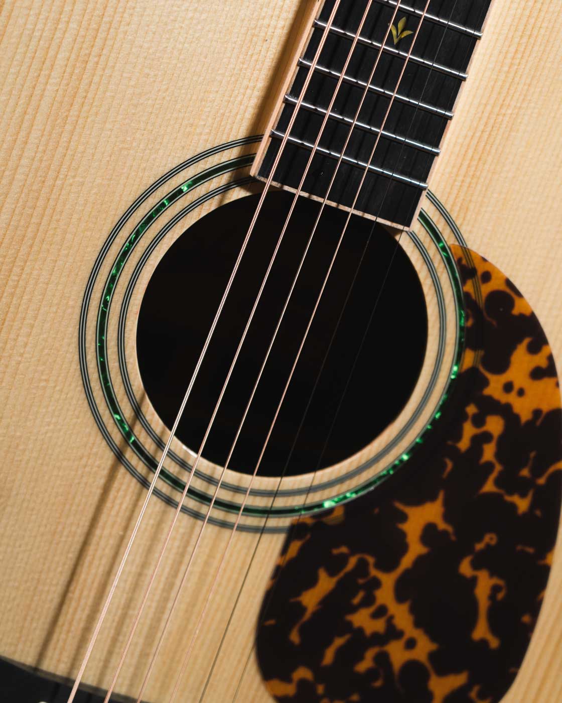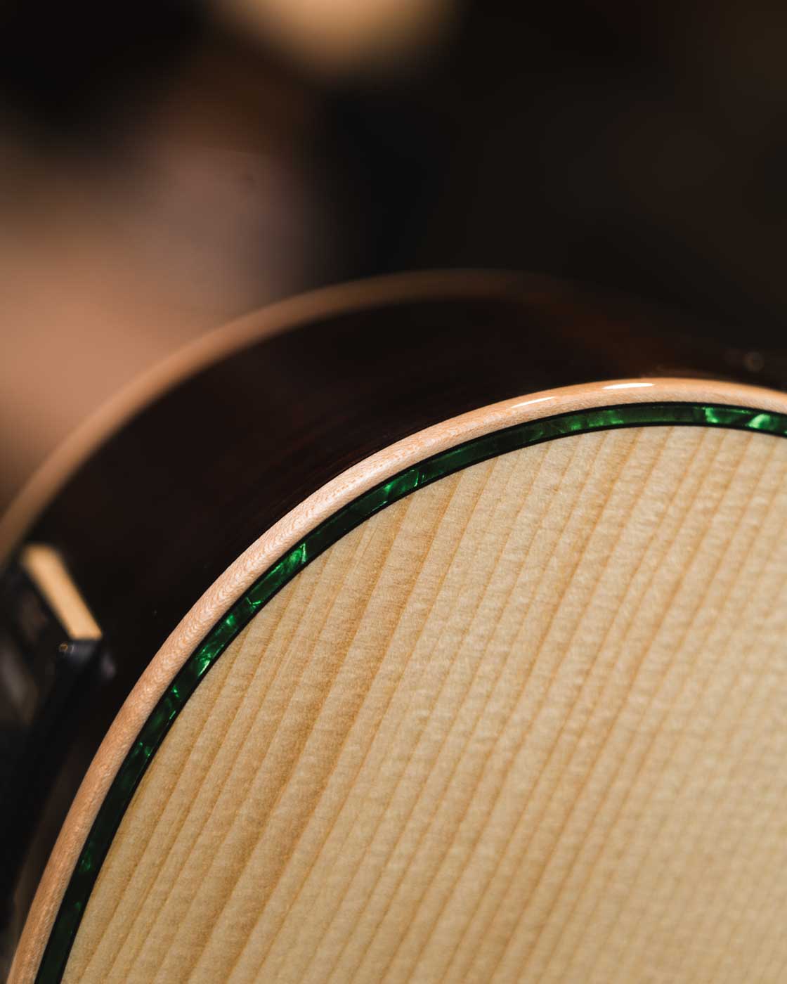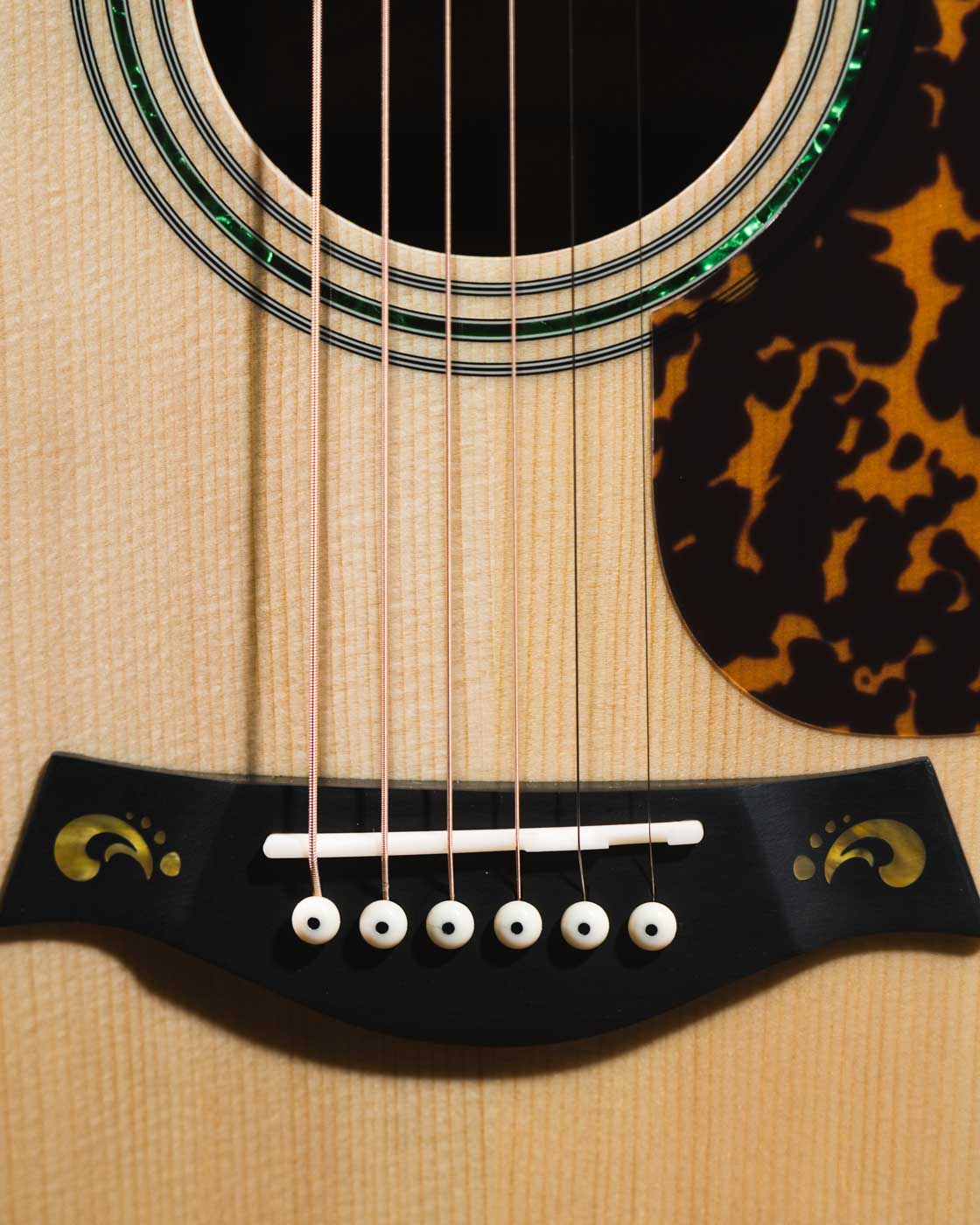 - Inlay Abalone ดีไซน์เฉพาะตัว: รายละเอียด Inlay Abalone ที่ถูกออกแบบอย่างบรรจงโดยศิลปินผู้ออกแบบ (Jugg) เอง ทำให้กีตาร์ตัวนี้มีความสง่างามและความเป็นเอกลักษณ์เฉพาะตัวอย่างลงตัว โดยยังคงรักษากลิ่นอายความคลาสสิกของกีตาร์โปร่งชั้นดีไว้