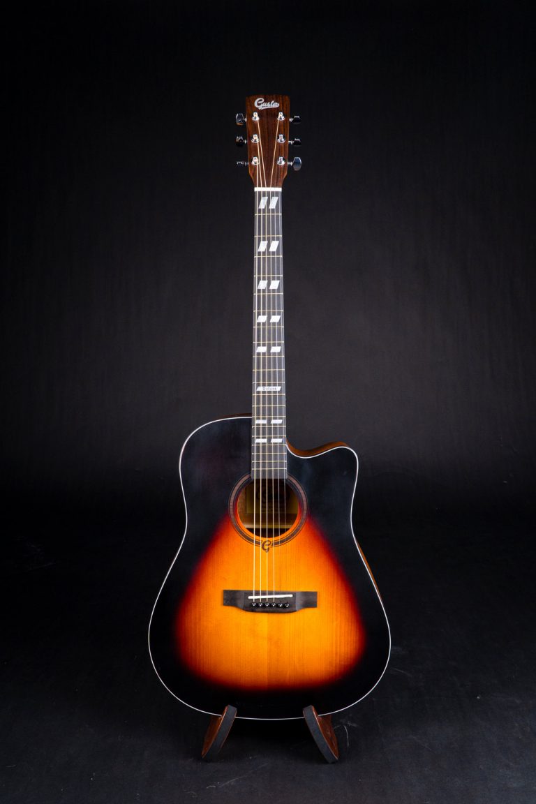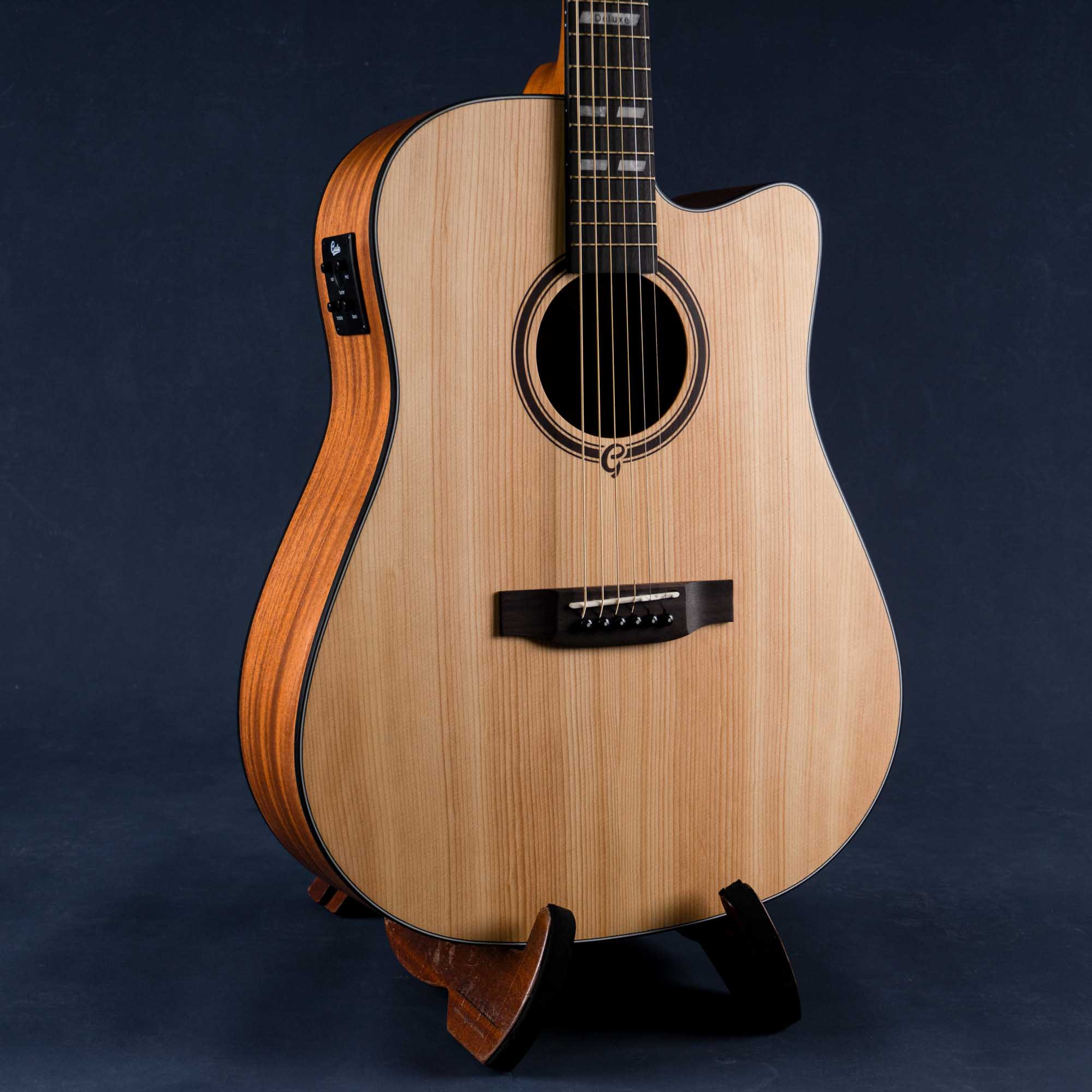 Gusta SDME-Deluxe กีตาร์โปร่งไฟฟ้ารุ่นใหม่จาก Gusta ที่ยังคงคุณภาพเกินราคาไว้ได้ดีเช่นเดิม รุ่นนี้มาในทรงเดรทน็อตโดยจะได้ไม้หน้าเป็นท็อปโซลิดหรือไม้แท้แผ่นเดียว เป็นไม้ซิทกาสปรูซที่ให้เสียงโทนใสและเสียงกลางเด่นชัด ยิ่งนานไปไม้แห้งเสียงจะหวานละมุนมากขึ้น ด้านข้างและด้านหลังเป็นไม้มะฮอกกานีเสริมมิติเสียงให้มีความหนามากขึ้น คอไม้มะฮอกกานี งานประกอบทำออกมาได้ยอดเยี่ยม อะไหล่ดีเช่นนัทและแซดเดิลทำจากกระดูก รวมถึงมีภาคไฟฟ้ามาให้เป็นรุ่น Gusta GTS เสียงใสเป็นธรรมชาติ ใครหาโปร่งไฟฟ้างานดีๆ รุ่นนี้ตัวเดียวใช้ได้ยาวๆ