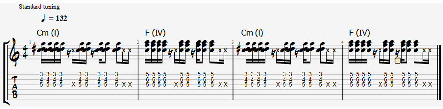 เพิ่มการดีดคอร์ดลงไปในจังหวะ 1,2,3,4 สร้างสัดส่วนและ ความเคยชินของการเล่นคอร์ดและการเล่น Ghost Note