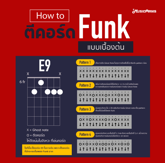 ดนตรี Funk มีภาคของ rhythm ที่เป็นเอกลักษณ์เล่นแล้วสามารถรู้ได้ทันทีว่าเป็น Funk วันนี้ musicarms จะมานำเสนอ การตีคอร์ดแบบเบื้องต้นของดนตรี Funk สำหรับผู้ที่กำลังสนใจดนตรีแนวนี้อยู่แต่ยังไม่รู้ว่าจะเริ่มตรงไหน