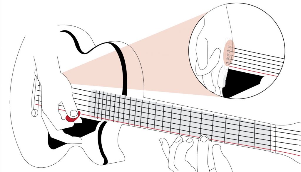 โซโล่สายที่ 6 ไม่ว่าจะเล่นสายเปิดจนไปถึงเล่นตำแหน่งเฟรตด้านใน เราจะใช้นิ้วชี้อุดเสียงตั้งแต่สาย 5 ลงไปถึงสายที่ 1 เลย หากโซโล่ด้วยการใช้นิ้ว กลาง นาง หรือก้อย นิ้วชี้เราก็ยังทำหน้าที่เป็นหลักในการอุดเสียง