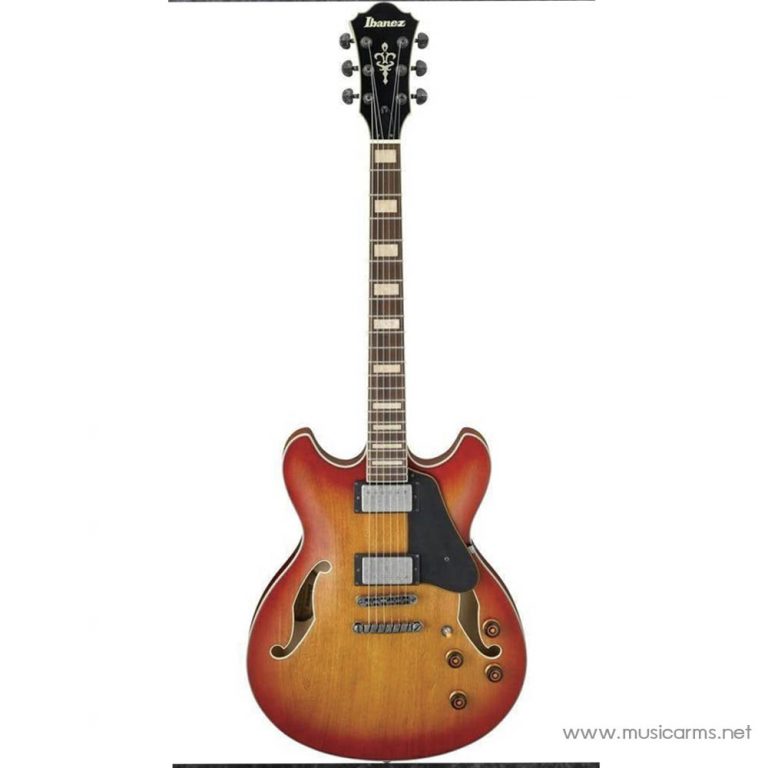 The ASV73 features a semi-hollow body, double cutaway design with a laminated linden top with ƒ holes and cream multi-binding on linden back and sides mated to a set-in nyatoh neck with a 22-fret laurel fingerboard with cream binding and aged acrylic block position markers. Components include a pair of Ibanez Classic Elite humbucking pickups with antique chrome covers and individual volume and tone controls, a Tune-o-matic style bridge and tailpiece, a plastic nut, a black pickguard, Sure Grip III knobs, and Ibanez tuning machines with half moon buttons. The finish and hardware are lightly reliced to suggest age.