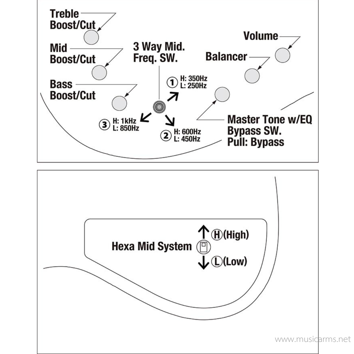 ระบบวงจร (EQ) Ibanez Sonitech S Preamp 3-band EQ พร้อมสวิตช์บายพาส (Push/Pull) และสวิตช์ปรับความถี่ย่านกลาง 3 ทาง พร้อมระบบ Hexa Mid