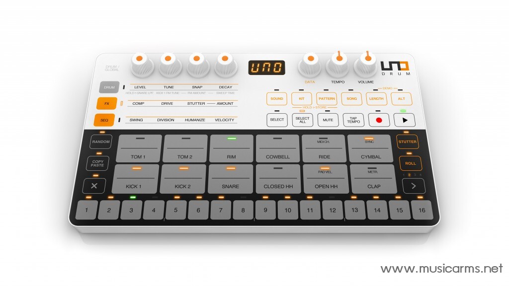 The most important element of any serious drum machine is the quality of its sounds, and UNO Drum is teeming with excellent ones. Build fat, punchy sounds with six true analog voices — kick, snares, claps, and hi-hats — designed by the analog gurus at Soundmachines. You also get 54 PCM samples — toms, rims, ride, and cowbell — derived from IK’s popular SampleTank 4. Best of all, you can craft massive rhythms by layering the analog and PCM sounds together with 11-voice polyphony. And if you love to tweak, you’ll appreciate UNO Drum’s impressive array of sound-shaping tools, including tune, snap, and decay for every sound, and global drive and compression effects.