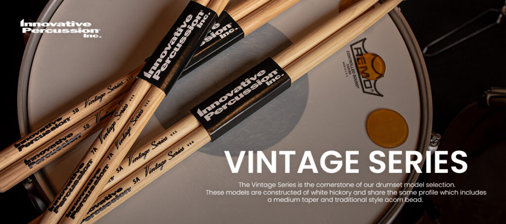 Vintage Series เป็นผลิตภัณฑ์หลักของ Innovative Percussion ที่โดดเด่นด้วยการเลือกใช้ไม้ฮิคอรี่ขาวคุณภาพดีที่มีลายเส้นตรง แข็งแรง และมีน้ำหนักพอเหมาะ จากนั้นไม้จะถูกกลึงลงมาจนมีขนาดสุดท้ายที่ยาว 16.125 นิ้ว มีรูปทรงเรียวปานกลาง และปลายไม้กลองแบบโบราณแบบอะคอร์น ต่อมาไม้จะถูกเคลือบแลคเกอร์บางๆ เพื่อให้จับได้ถนัดและทนทานมากขึ้นเพื่อให้คุณเล่นได้ทุกงาน