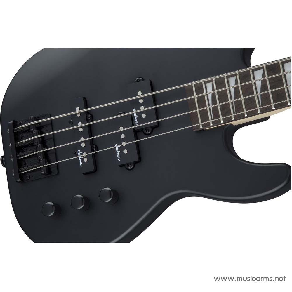 A Jackson P style neck pickup and Jackson J style bridge pickup power this 4-string bass, which also features a pair of volume knobs, single tone knob, hardtail bridge with black base plate and Jackson-branded tuners.