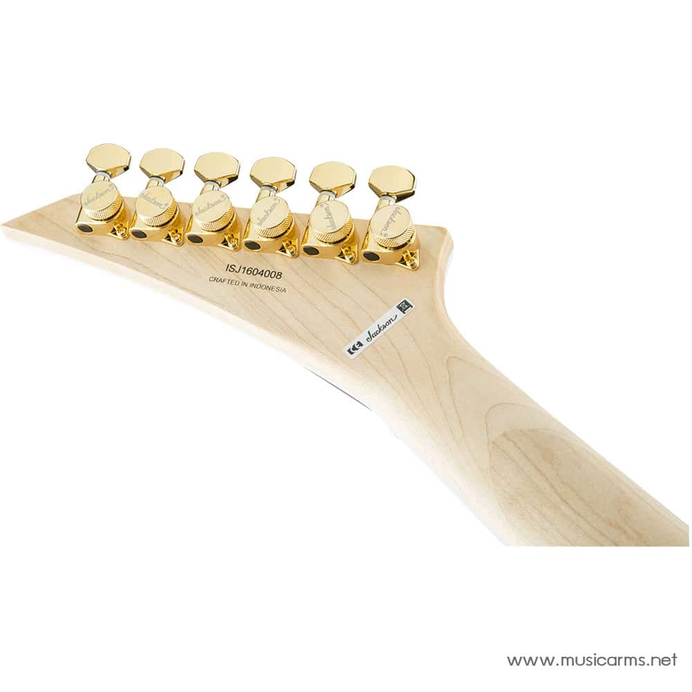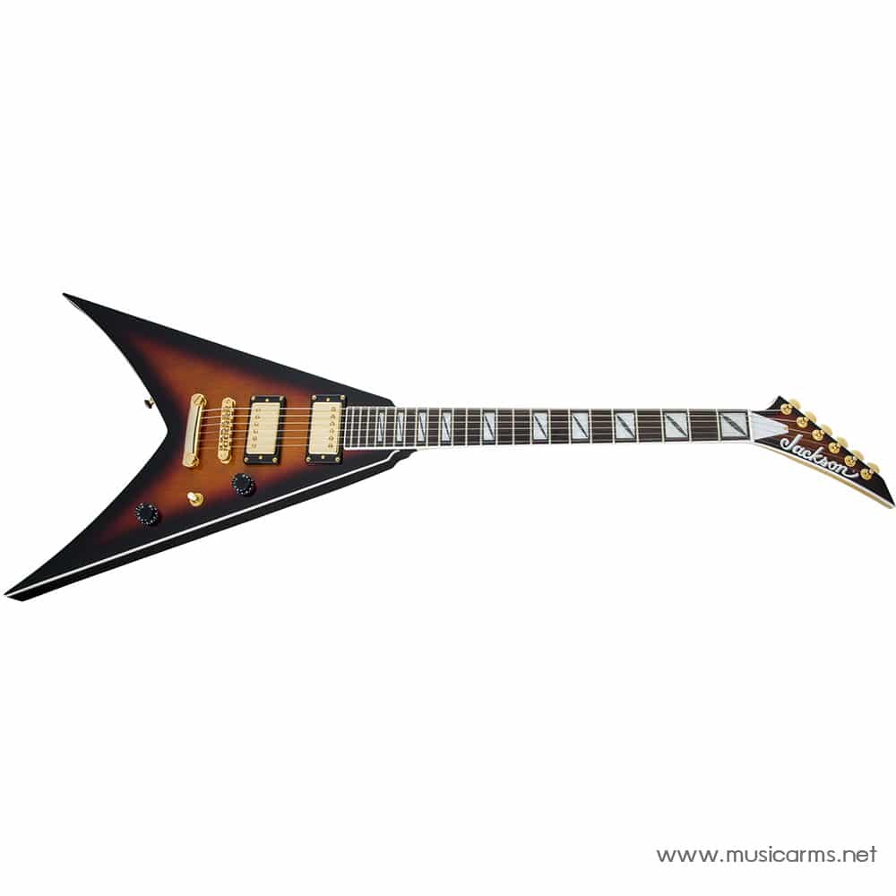The King V KVT offers premium features including a mahogany body, graphite-reinforced through-body maple neck with hand-rubbed oil back finish and wrap-around heel. Its 12”-16” compound radius ebony fingerboard features 24 jumbo frets, shark eye block inlays and single-ply white binding around the body, neck and Jackson pointed 6-in-line headstock.