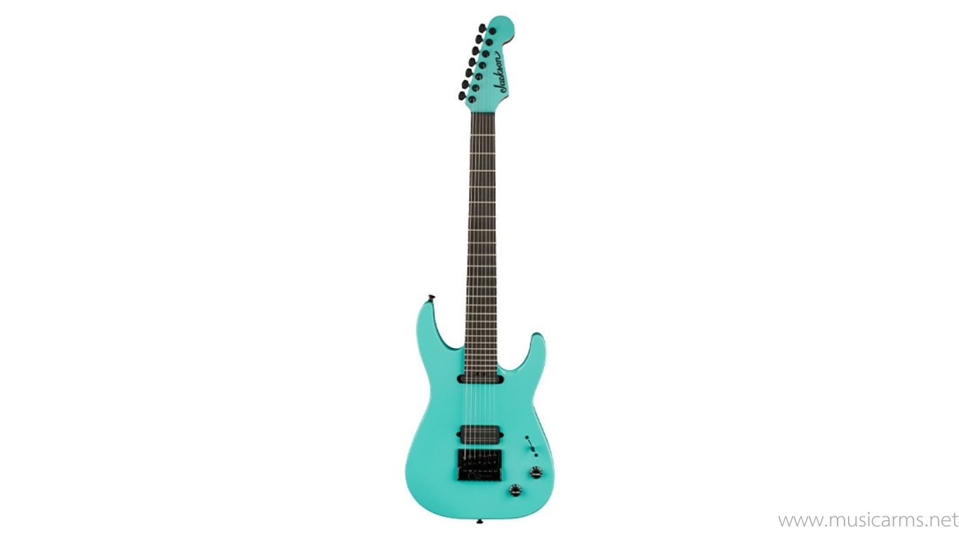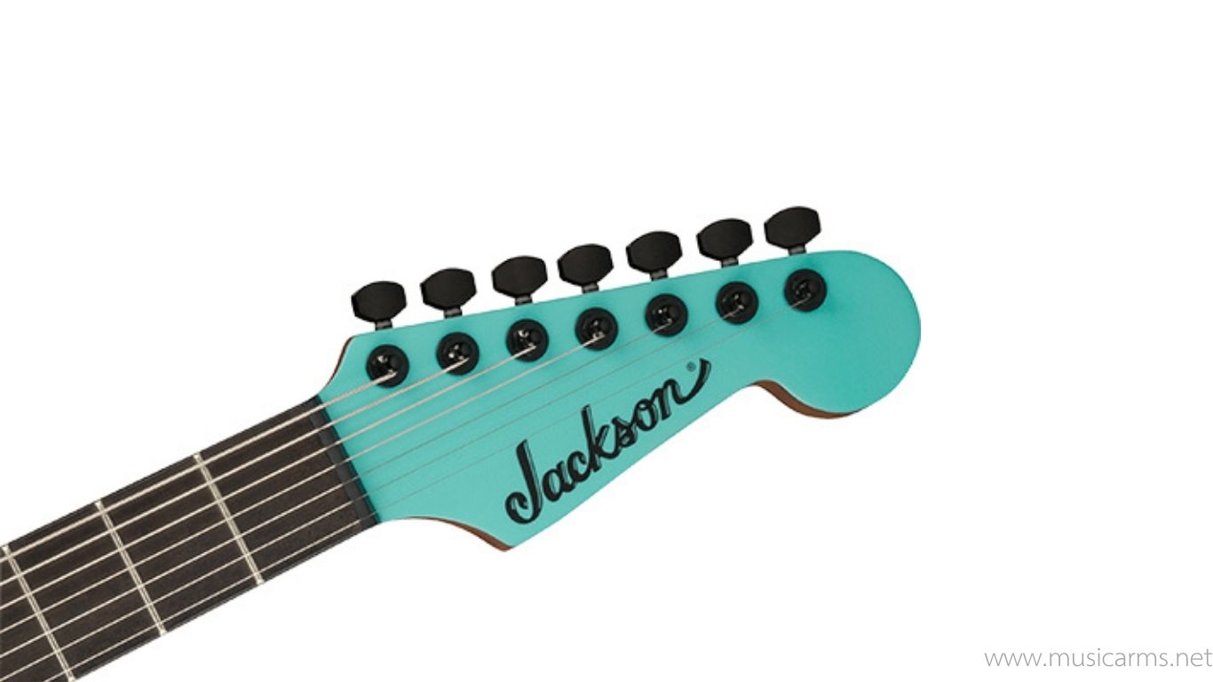 The guitar is decked out in a mouth-watering Aquamarine finish with a 7-string color matched licensed Fender® Stratocaster® headstock, complete with all-black hardware including the PPS nut, Dunlop® strap locks and Jackson locking tuners.
