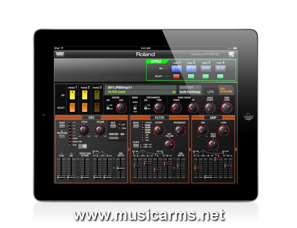 JP Synth Editor is an iPad app that allows you to edit the SuperNATURAL Synth Tones of the JUPITER-50. Control your synth tone parameters, including the Vintage filter type with the iPads touchscreen.Download free from the Apple App Store.