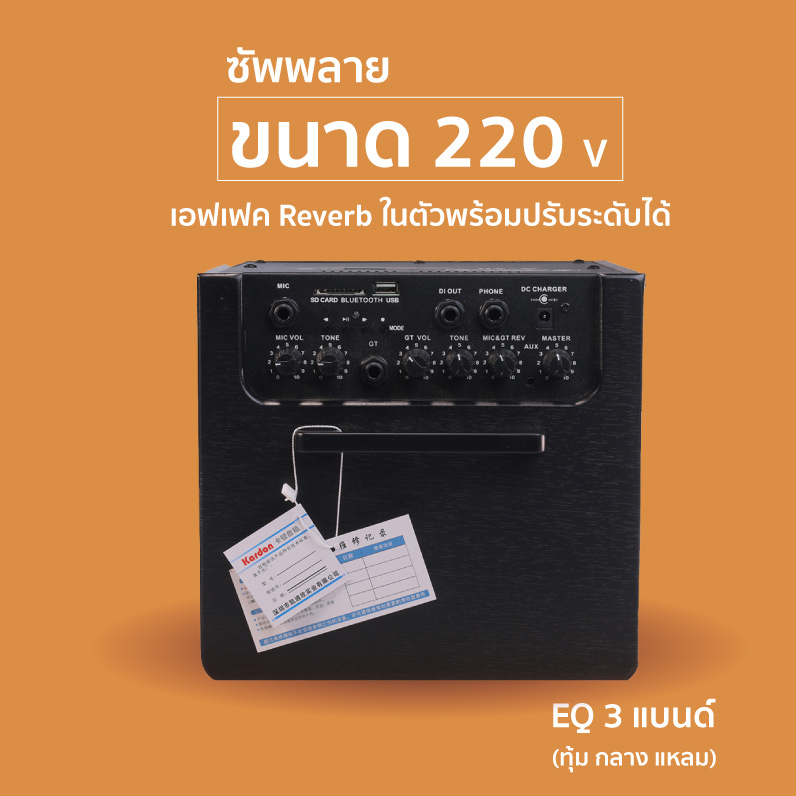 Kardon A20 แอมป์กีต้าร์โปร่งเสียงใสๆสำหรับซ้อมส่วนตัวหรือจัดปาร์ตี้ขนาดย่อมๆ รุ่นนี้จะมีกำลังขับ 20 วัตต์ ให้ซาวด์ที่คมชัด มีความพิเศษที่สามารถต่อไมโครโฟนได้ พร้อมปุ่มปรับระดับเสียง จะร้องจะเล่นก็ทำได้ในตัวเดียว รวมถึงสามารถปรับ Tone ได้ตามต้องการจากปุ่มควบคุมหน้าตู้ มีเอฟเฟค Reverb มาให้ในตัว ช่วยให้ซาวด์กีต้าร์มีมิติมากขึ้น ต่อหูฟังและ Aux in ได้ รวมถึงสามารถเชื่อมต่อ Bluetooth ได้อีกด้วย งานดีมีคุณภาพแบบนี้ ราคาเบาๆถือว่าน่าสนใจอย่างมาก