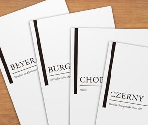 | Lesson Songs | Burgmüller 25 (25 Etudes Faciles, Opus 100) Czerny 30 (Etudes de Mécanisme, Opus 849) Beyer 106 (Vorschule im Klavierspiel, Opus 101) Chopin Walzer (Chopin waltzes series 1-19) Alfred’s Basic Piano Library Lesson Book Level 1A Alfred’s Basic Piano Library Lesson Book Level 1B |