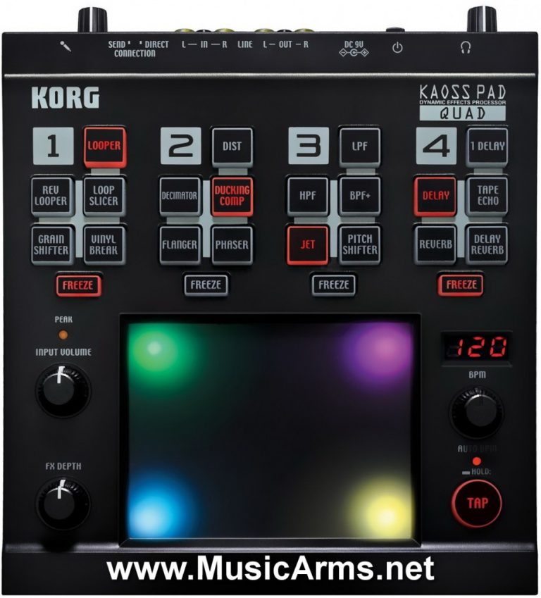 As suggested by the name “Quad”, this new Kaoss Pad lets you use up to four effects simultaneously. These effects can be synced to the beat of your music, to freely transform your song in realtime. Any audio source can be processed; an MP3 player, a mixing board, an instrument, even vocals via the mic input! The expressive performance potential that arises from the Kaoss Pad Quad leaves other effect units in the dust, and rapidly approaches the realm of an “instrument”. The brilliant and colorful LED touchpad illumination adds a strong sense of individuality, further enhancing the Kaoss Pad Quads unique character.
