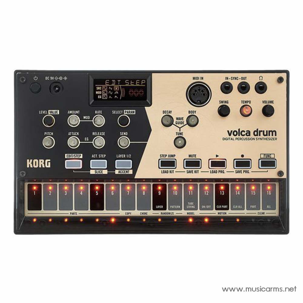 Korg Volca Drum ซินธิไซเซอร์ชุดกลองแบบจำลองอนาล็อก DSP สุ่มตัวอย่างด้วย PCM ซึ่งเน้นที่ตัวอย่างสแนร์ กลองเบส และฉาบ คุณจึงสามารถสร้างเสียงเพอร์คัสชั่นได้หลากหลาย นอกจากนี้ไม่ได้จำกัดอยู่แค่เสียงกลองเท่านั้น ด้วยกระบวนการ DSP คุณสามารถสร้างเสียงประเภทใดก็ได้ภายในข้อจำกัดของหกส่วน การออกแบบเสียงสองชั้นมีทั้ง sine, sawtooth, noise และคุณสามารถใช้รูปคลื่นทั้งสามนี้เพื่อสร้างเสียงอะไรก็ได้ที่คุณต้องการ การใช้ความลึกของ Wavefolder เพื่อเพิ่มโอเวอร์โทนที่ซับซ้อน และใช้โอเวอร์ไดรฟ์เพื่อให้เสียงของคุณมีผลกระทบมากขึ้น Korg Volca Drum ช่วยให้คุณสร้างเสียงที่แตกต่างในแบบของคุณเอง