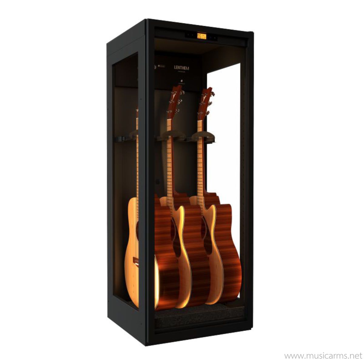 Lenthem CMI-305DT คือตู้โชว์กีตาร์ระดับพรีเมียมบนความจุ 305 ลิตร โดดเด่นด้วยกระจกใส Tempered Glass 3 ด้าน (หน้า-ซ้าย-ขวา) ทำให้ตู้ดูไม่อึดอัดและโชว์ความงามของเครื่องดนตรีได้เต็มที่ ภายในติดตั้งที่แขวนกีตาร์ปรับระดับได้และโฟมรองรับคุณภาพสูง พร้อมหน้าจอดิจิทัลแสดงสถานะความชื้นแบบเรียลไทม์