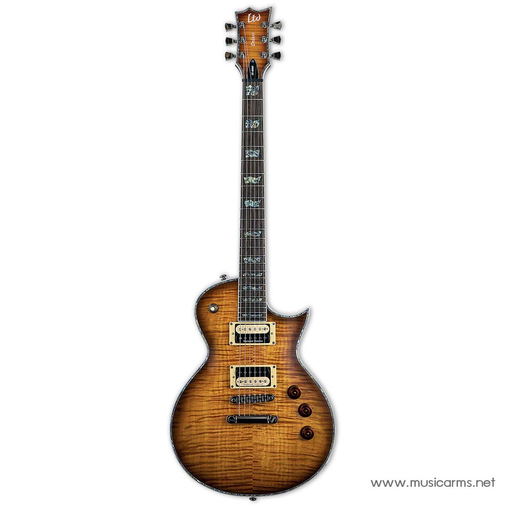 Guitars in the LTD EC-1000 Series are designed to offer the tone, feel, looks, and quality that working professional musicians need in an instrument, along with the pricing that typical musicians can still afford. The EC-1000FM has all of the classy LTD Deluxe features that set it apart from other guitars in its range, such as abalone inlays and purfling, full body/neck/headstock binding, and premier components like LTD locking tuners, a Tonepros locking TOM bridge and tailpiece, and classic Seymour Duncan JB/’59 passive pickups. It also offers set-thru construction with a mahogany body, a flamed maple top, 3 pc. mahogany neck, and 24-fret pau ferro fingerboard. Available in Amber Sunburst finish.