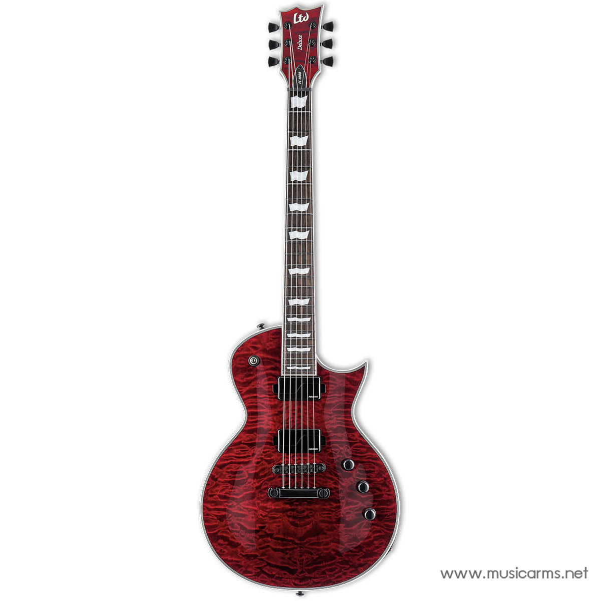 LTD EC-1000 QM เป็นการอัปเดตครั้งสำคัญของซีรีส์ยอดนิยมที่มอบรูปลักษณ์อันหรูหราและเหนือระดับด้วยไม้หน้า Quilted Maple ที่คัดสรรมาอย่างประณีต พร้อมสี See Thru Black Cherry ที่ดูเย้ายวนใจ การออกแบบเน้นความประณีตในทุกจุด ไม่ว่าจะเป็นการเดินขอบ (Binding) แบบหลายชั้นรอบตัวบอดี้และหัวกีตาร์ ไปจนถึงอะไหล่สีดำที่เสริมให้ตัวเครื่องดูดุดันและทันสมัย กีตาร์ตัวนี้มาพร้อมกับโครงสร้าง Set-Thru บนสเกล 24.75 นิ้ว ที่ออกแบบมาให้รอยต่อช่วงคอมีความเรียบเนียน (Smooth Heel Joint) ช่วยให้การเล่นในเฟรตลึกๆ เป็นไปได้อย่างไหลลื่น ผสมผสานวัสดุคุณภาพสูงอย่างบอดี้ Mahogany และคอ Mahogany 3 ชิ้น เพื่อสร้างรากฐานของเสียงที่แน่นและมีพลัง พร้อมตอบรับทุกสไตล์การเล่นในยุคปัจจุบัน