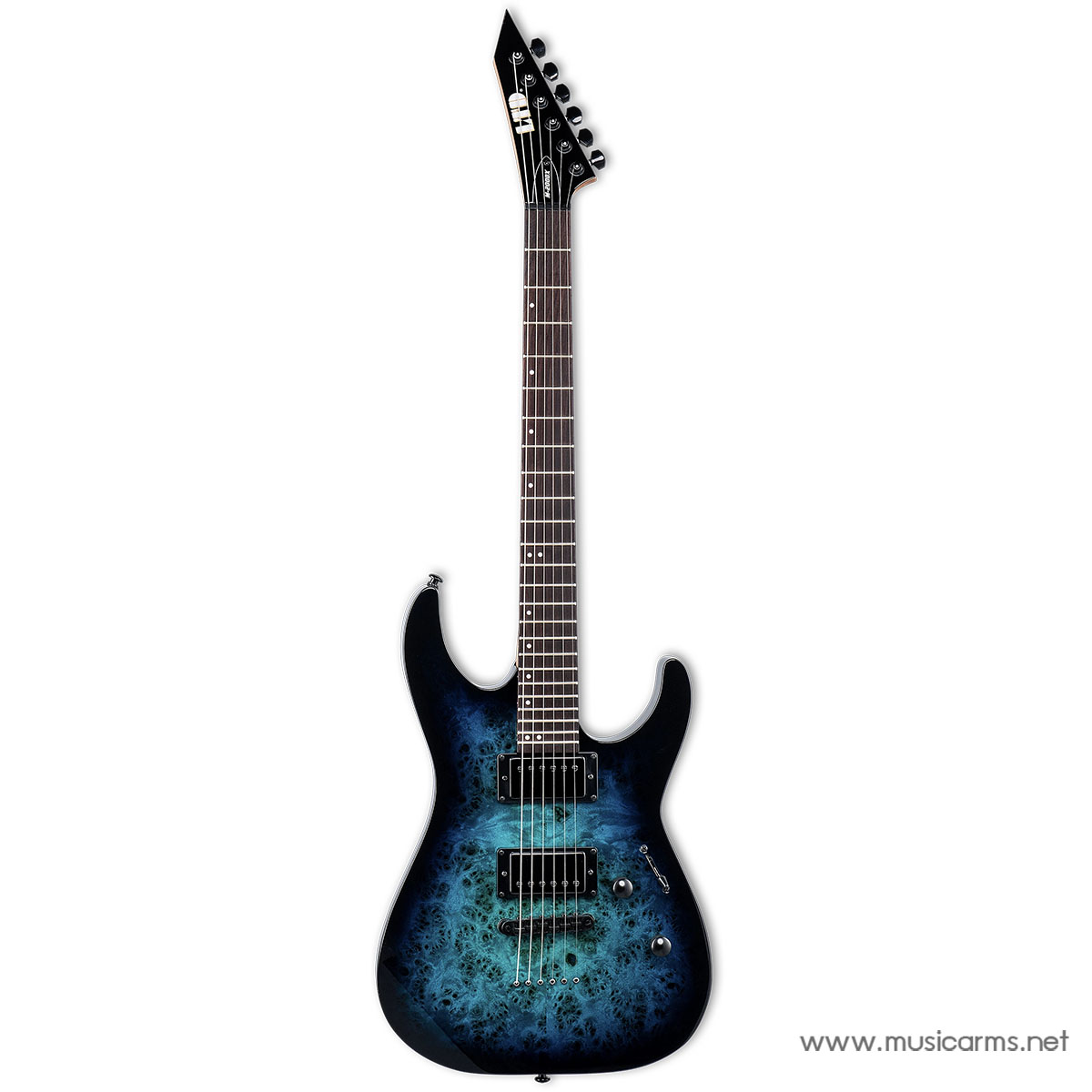 LTD’s DX range is specifically engineered to provide musicians with access to high-quality instruments at a price point far more accessible than its impressive feature set would suggest. The M-200DX showcases the iconic, streamlined M shape, elevated by a stunning burled poplar top set against a light and resonant poplar body. Built with precision bolt-on construction at a 25.5” scale, this model incorporates sophisticated features typically reserved for higher-end instruments, including full body binding, offset dot inlays, and a bold reverse inline headstock. It is an instrument that balances professional playability with a visual flair that stands out on any stage.