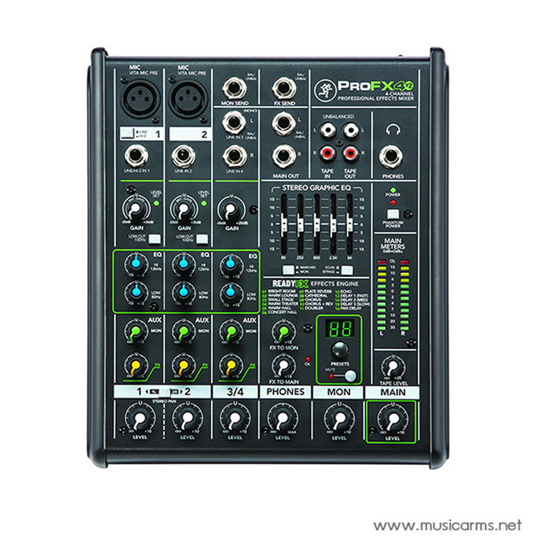Mackie ProFX4v2 Mixer มิกเซอร์แบบอนาล็อค 4 แชนแนล พร้อมสรรพด้วยช่องเสียบ Mic, Line และ Aux เอฟเฟค Ready FX ที่ทาง Mackie คิดค้นขึ้นมา เป็นเอฟเฟค Reverb, Delay และ Chorus 16 แบบในตัว พร้อมด้วยระบบ Low-noise Mackie Vita ช่วยลดเสียงรบกวน สามารถปรับ EQ ได้ตามต้องการเพื่อให้คุณภาพเสียงออกมาดีที่สุด โดยระบบเสียงจะเป็นแบบสเตอริโอ สามารถต่อเข้ากับกีต้าร์หรือเบสตรงๆโดยช่องเสียบแบบ Hi-Z Input เอนกประสงค์ครบเครื่อง