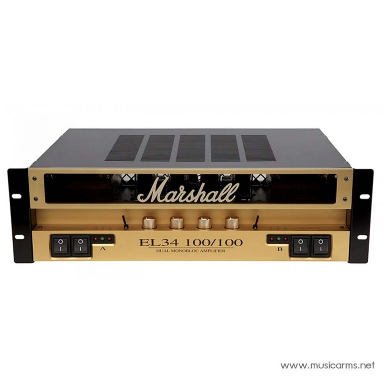 Marshall EL34 100/100 Dual Monobloc Amp หัวแอมป์หลอดที่ให้โทน EL34 ที่กลมกลืนกันในแชสซีแร็คแบบสามยูนิตระดับมืออาชีพ เพาเวอร์แอมป์สเตอริโอแบบติดตั้งบนชั้นวางที่ขับเคลื่อนด้วยหลอด EL34 ถึง 8 หลอด ออกแบบมาเพื่อใช้กับยูนิตเอฟเฟคแร็ค ให้เสียง Marshall แบบคลาสสิกพร้อมการสลับเสียงแบบดั้งเดิมหรือแบบสมัยใหม่ ซึ่งสามารถควบคุมได้จากระยะไกล คำว่า Dual Monobloc หมายความว่าด้านสเตอริโอหรือช่องสัญญาณ (A และ B) แต่ละตัวเป็นยูนิตโมโนอิสระที่มีการควบคุมแยก ให้เสียงที่ยอดเยี่ยมมีความสมบูรณ์และความบริสุทธิ์สูงสุดของเสียง
