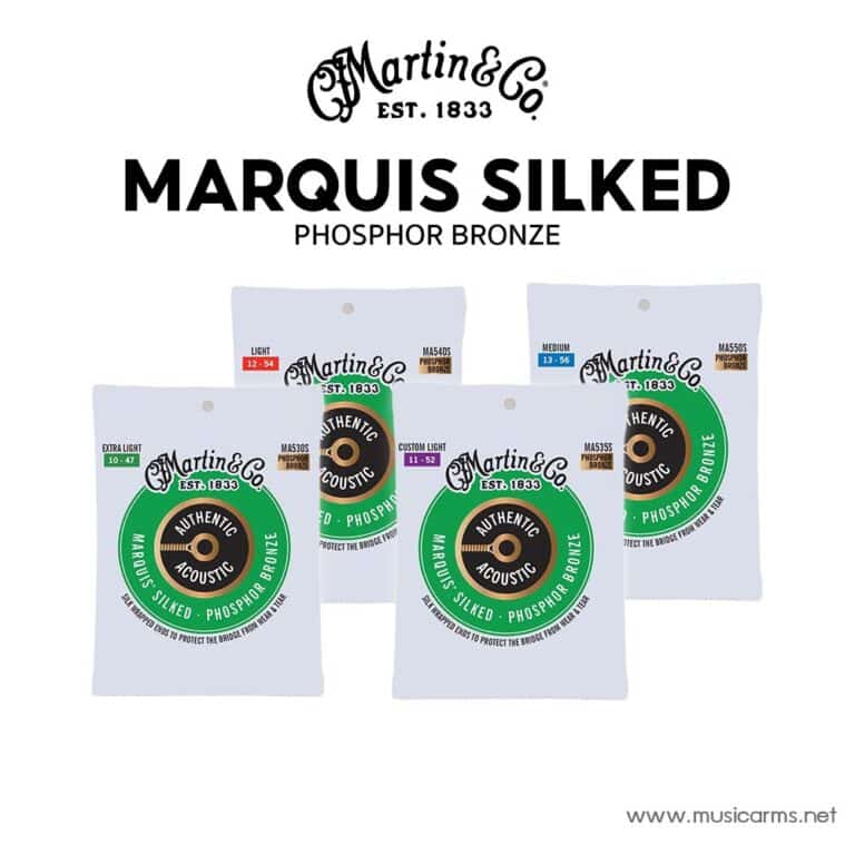 Martin Marquis Silked Phosphor Bronze สายกีต้าร์โปร่งออกแบบมาเพื่อให้กีตาร์ชั้นดีของคุณมีการปกป้องที่ดียิ่งขึ้น มีการพันผ้าไหมแบบนุ่มที่ปลายสาย เพื่อป้องกันการสึกหรอบนสะพาน การพันผ้าไหมเพิ่มชั้นหรือการป้องกัน เพิ่มความต้านทานการกัดกร่อน และให้ความเสถียรในการปรับแต่งที่เชื่อถือได้ สาย Phosphor Bronze ผลิตด้วยทองแดง ดีบุก และฟอสฟอรัส ให้โทนเสียงที่เข้มและอุ่นกว่าสาย 80/20 เล็กน้อย
