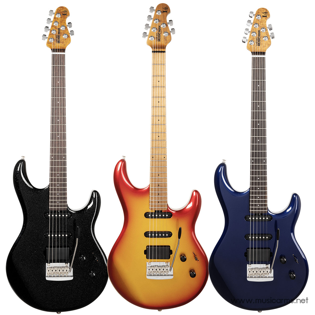 แต่ละรุ่นมีตัวบอดี้เป็นไม้ Alder เพื่อการสั่นพ้องที่สมดุล คอเป็นไม้ Roasted Figured Maple เพื่อให้ความรู้สึกที่เหนือกว่าและเสถียรภาพที่ยอดเยี่ยม มาพร้อมกับ 12 dB adjustable gain boost สำหรับเพิ่มพลังเสียง และลูกบิด Locking Tuners จับคู่กับบริดจ์ Music Man vintage-style floating tremolo เพื่อการตั้งสายที่มั่นคงและการเล่นที่แสดงออกได้อย่างเต็มที่