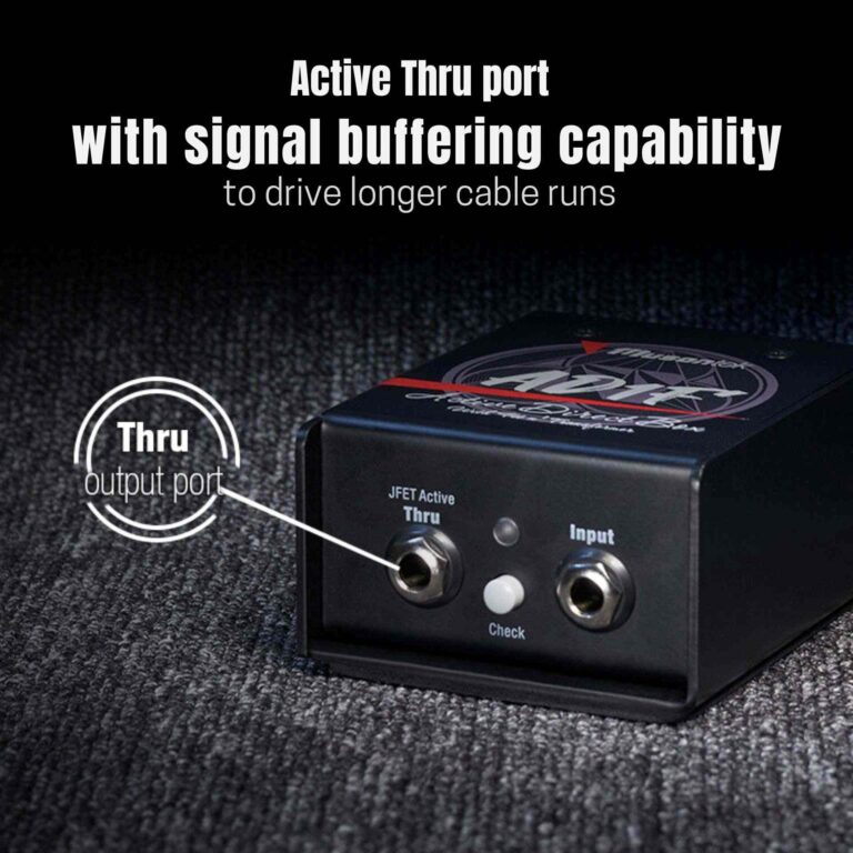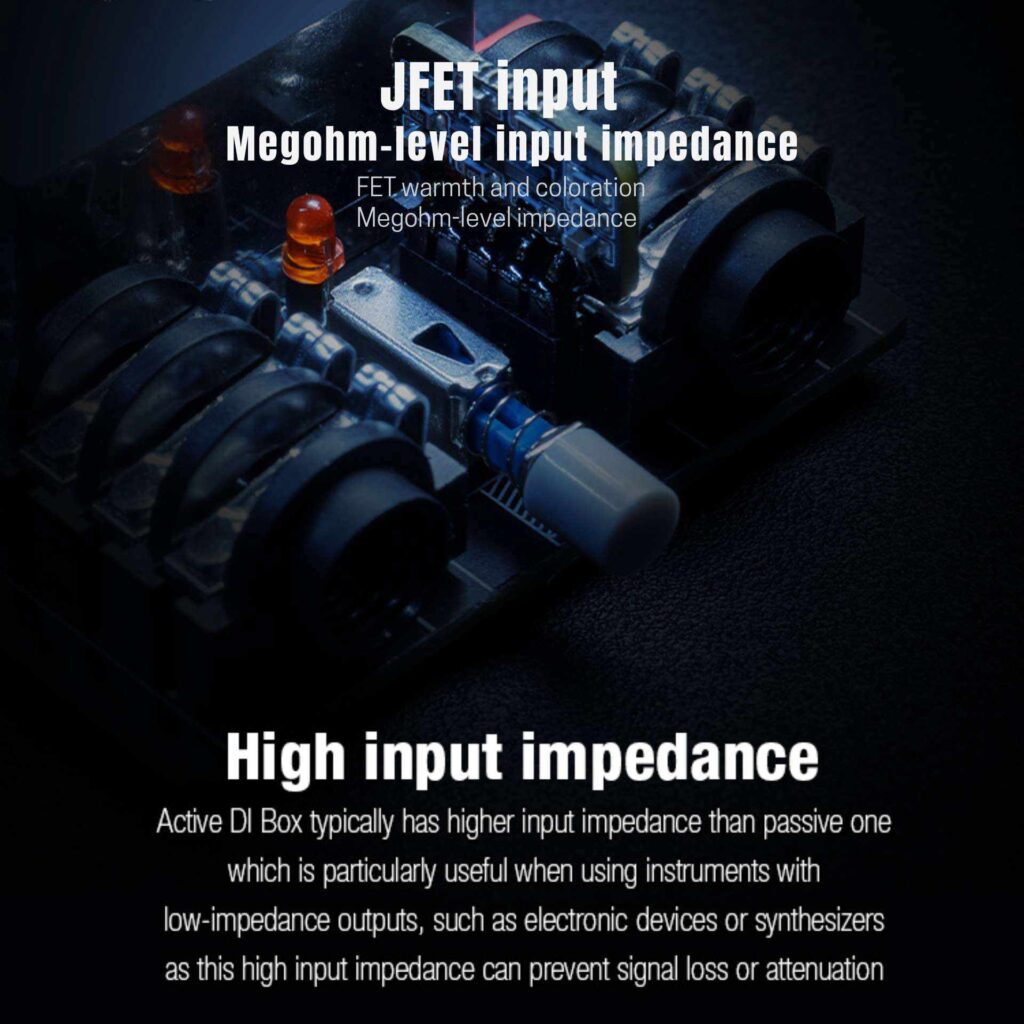 FET warmth and coloration Megohm-level impedance High input impedance Active DI Box typically has higher input impedance than passive one which is particularly useful when using instruments with low-impedance outputs, such as electronic devices or synthesizers as this high input impedance can prevent signal loss or attenuation.