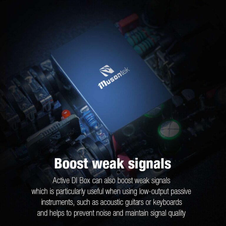 ล่อง DI แบบแอคทีฟมีความสามารถในการเพิ่มสัญญาณที่อ่อนแอหรือสัญญาณที่มีความแรงต่ำ โดยการทำงานนี้จะช่วยให้สัญญาณจากเครื่องดนตรีที่มีเอาต์พุตต่ำ เช่น กีตาร์โปร่งหรือคีย์บอร์ด ถูกขยายให้มีความชัดเจนและเสถียรมากขึ้น กล่อง DI แบบแอคทีฟจะเสริมความแรงของสัญญาณที่ได้รับและส่งออกไปยังอุปกรณ์ต่อไป เช่น การ์ดเสียงหรือมิกเซอร์ ด้วยความสามารถในการเพิ่มสัญญาณนี้ จะช่วยป้องกันปัญหาการสูญเสียสัญญาณหรือเสียงรบกวนที่อาจเกิดจากการส่งสัญญาณที่อ่อนแอผ่านสายเคเบิลยาว นอกจากนี้ยังช่วยรักษาคุณภาพของสัญญาณให้ดีขึ้น ทำให้เสียงที่ได้มีความคมชัดและสมบูรณ์แบบมากขึ้น