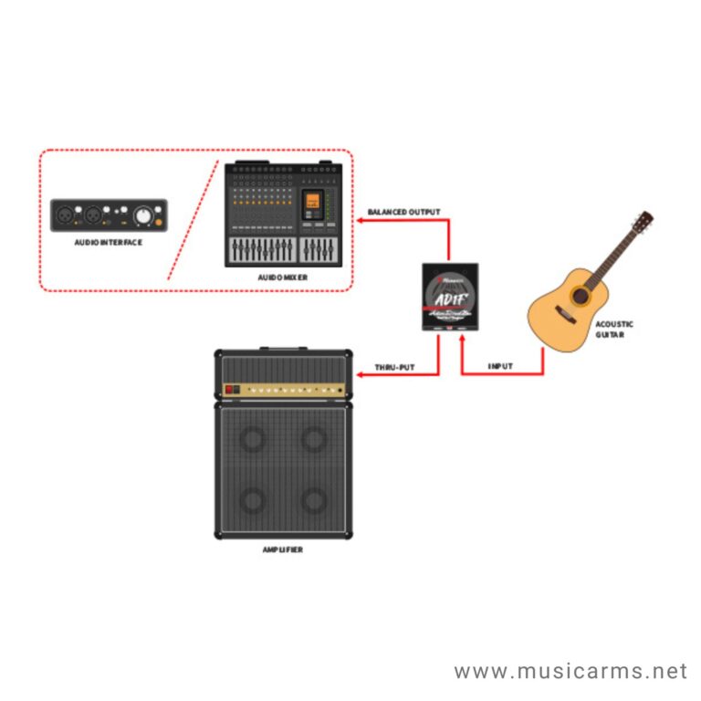 - ใช้กีตาร์โปร่ง เชื่อมต่อสัญญาณเข้ากล่อง DI แบบแอคทีฟ ซึ่งจะแปลงสัญญาณให้เป็นสัญญาณสมดุลเพื่อส่งไปยังการ์ดเสียง/มิกเซอร์ หรือส่งออกตรงไปยังแอมพลิฟายเออร์