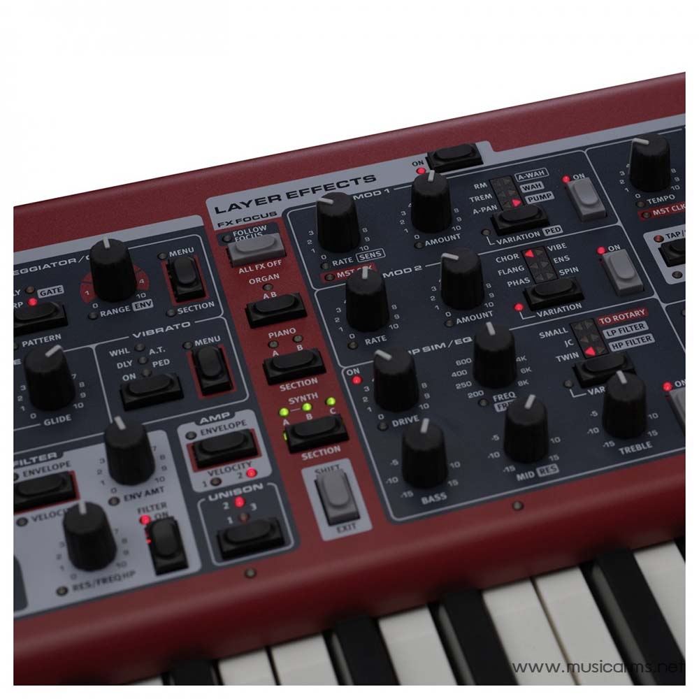 - ส่วนซินธิไซเซอร์พร้อมกลไก Nord Wave 2 (อนาล็อกเสมือน, ตัวอย่าง, FM และคลื่นดิจิตอล) และ 3 ชั้น