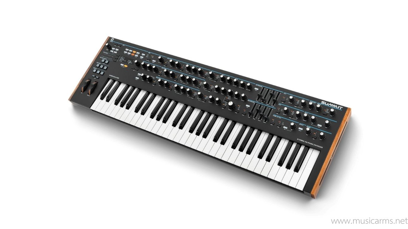The Summit was developed from the Peak synthesizer, which is an 8-voice hybrid model. The Summit expands this to 16 voices and adds bi-timbral functionality (two sounds at the same time), along with a 61-key keyboard, making it suitable for both studio production and live performance.
