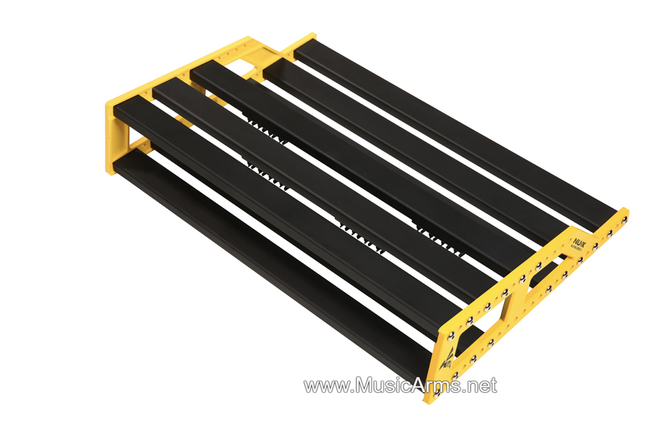 NUX Bumblebee is made by anodized aluminum material; which is “solid as a rock, light as a pillow”. The bottom of the platforms are carved and well-supported, and gives you some space to cover your cables without losing any strength. And the side parts are strongly holds all the parts together, it can absorb the shock when you hit your pedal footswitch.