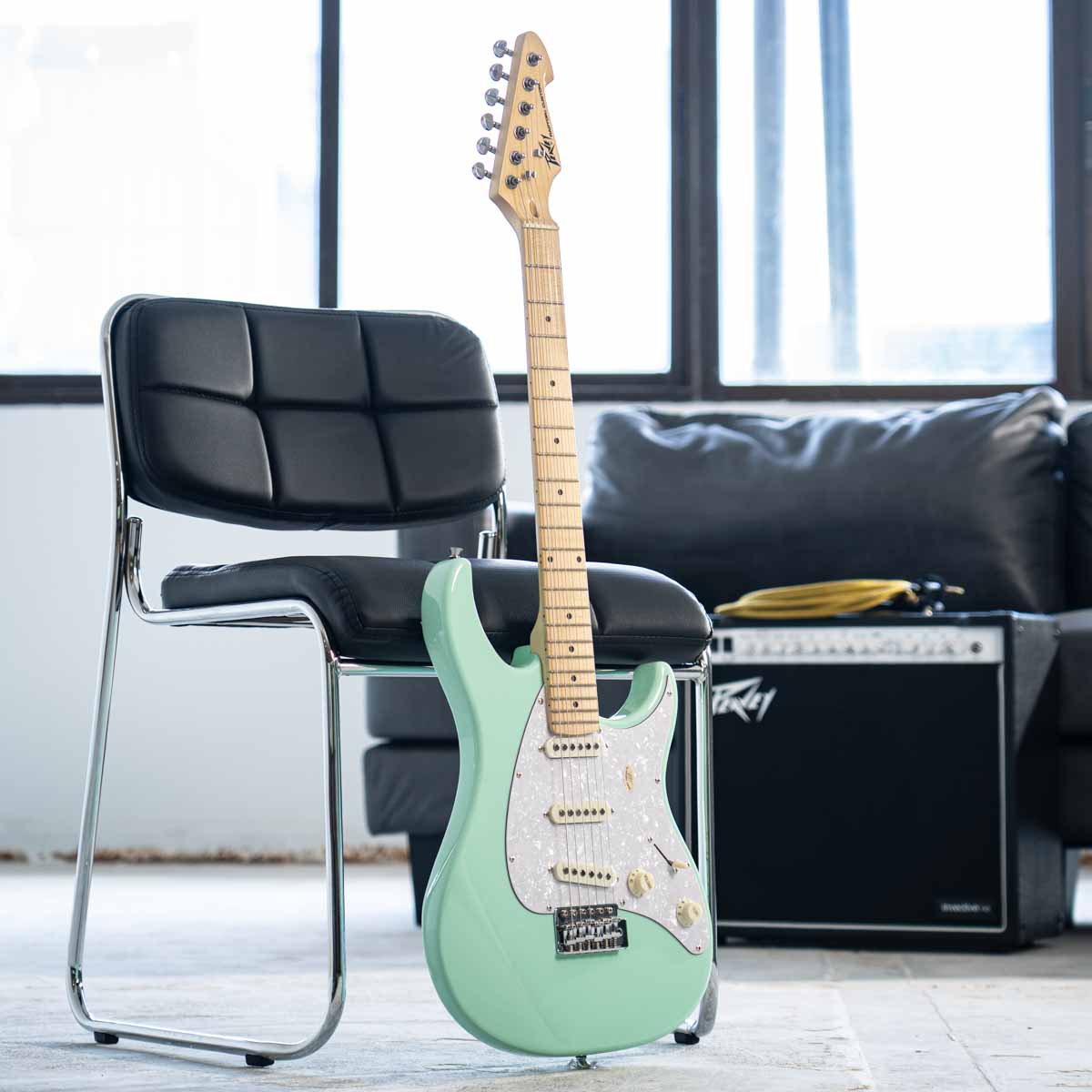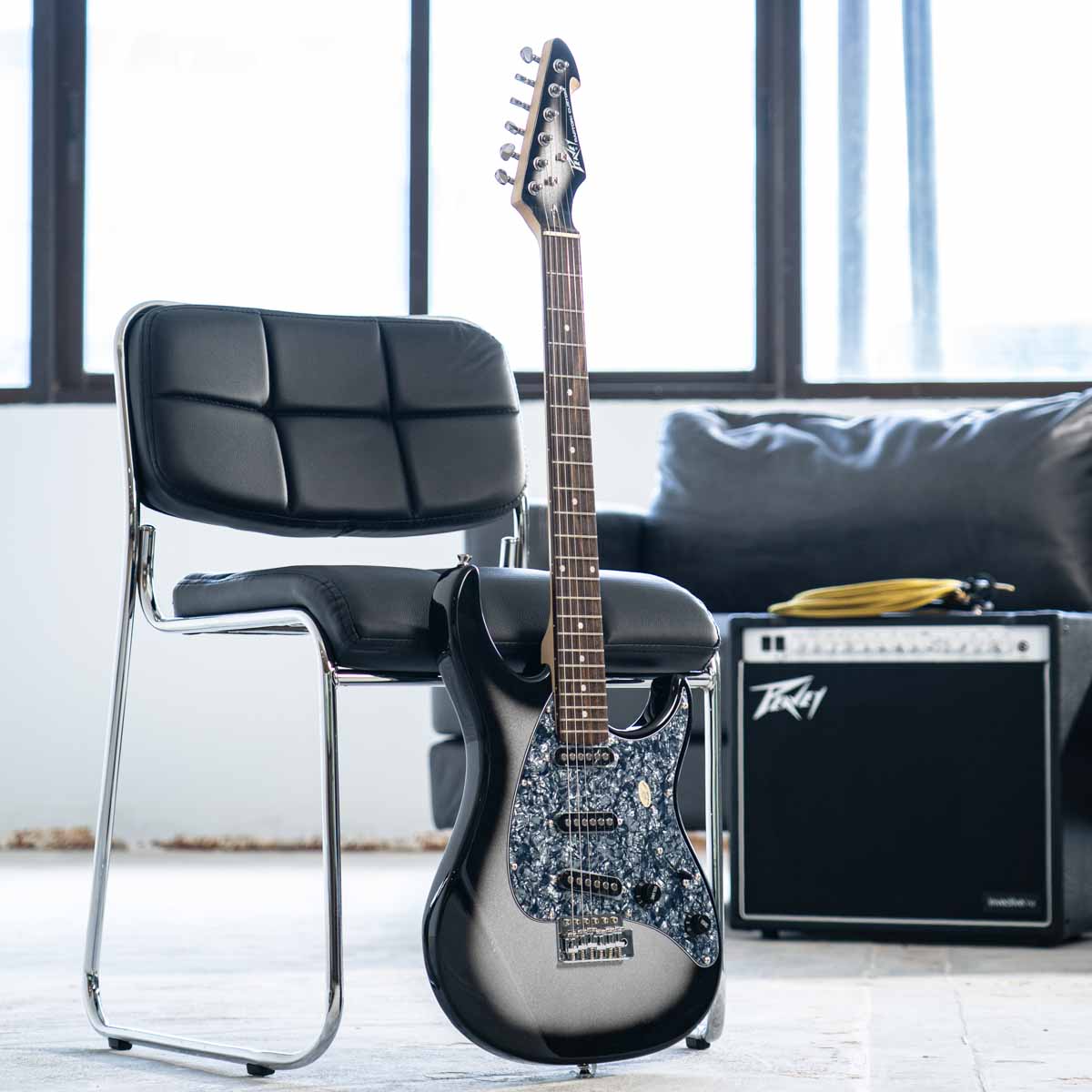 • Peavey six-in-a-line headstock with ergonomic tuner placement, straight string pull