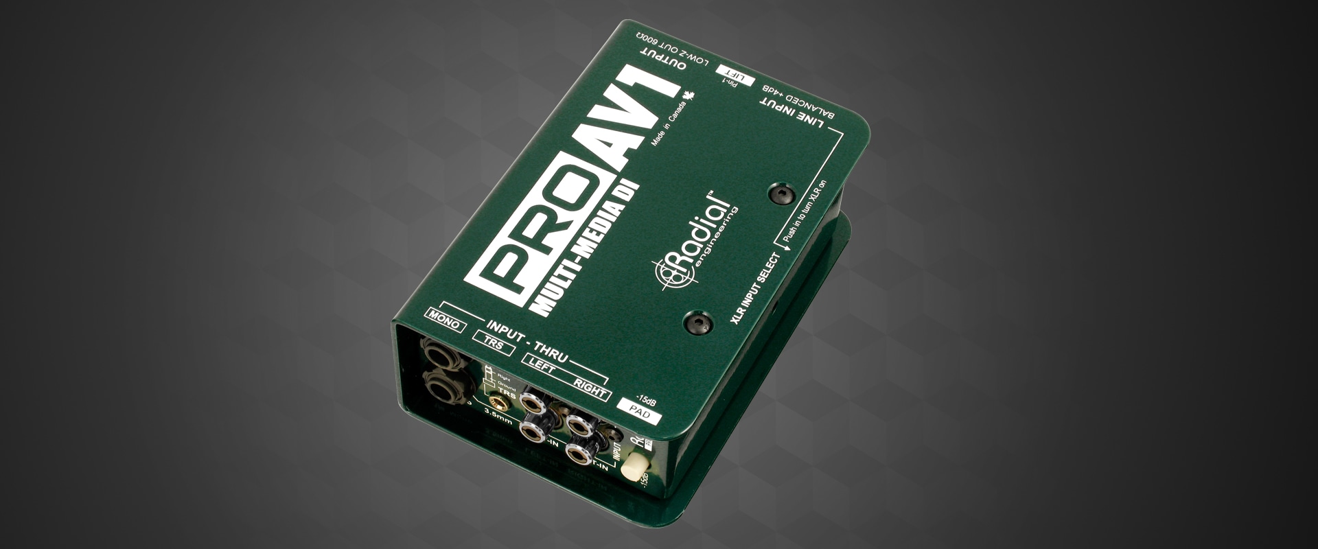 Radial ProAV1 เป็นกล่อง DI แบบพาสซีฟที่ใช้งานได้หลากหลายสำหรับงานมัลติมีเดีย มีการออกแบบที่ใช้งานง่ายและเงียบสนิทด้วยระบบพาสซีฟ พร้อมระบบแยกสัญญาณด้วยหม้อแปลงที่ช่วยขจัดเสียงฮัมและเสียงรบกวน และสามารถจัดการกับสัญญาณชั่วคราวที่มีระดับสูงมากได้โดยไม่เกิดความผิดเพี้ยน