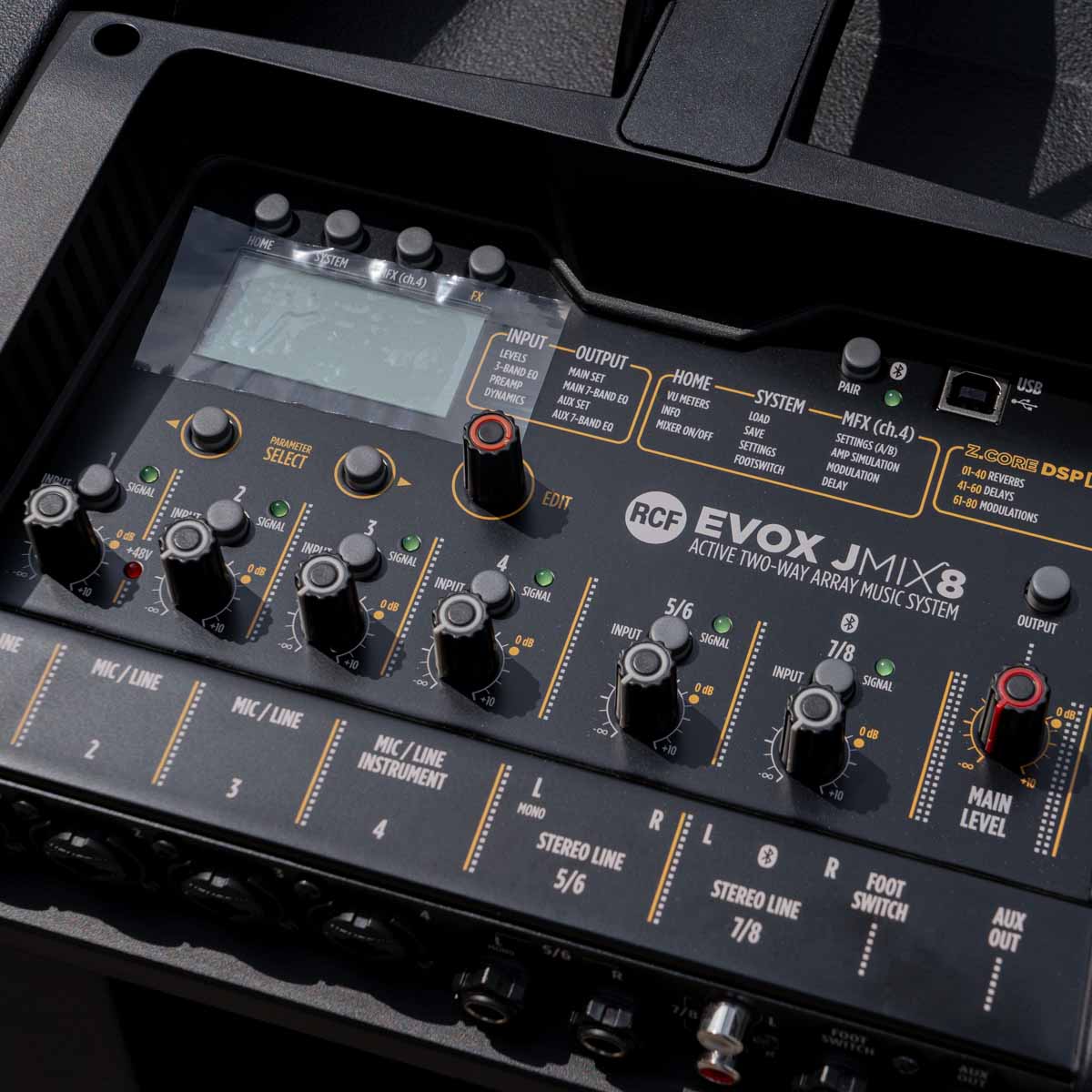 Taking the EVOX J Series one step further, RCF has added an 8-input Digital Mixer to the system. The onboard processing power of the innovative Z.CORE DSP provides not only full mix functions; it includes high-quality instrument FX and AMP simulations. An EVOX iOS/Android-compatible app allows to manage the JMIX8. Adding Bluetooth audio and Hi-Z instrument input,the EVOX JMIX8 combines the quality and reliability of RCF transducers and amplification with a powerful remote controllable 8-channel digital mixer