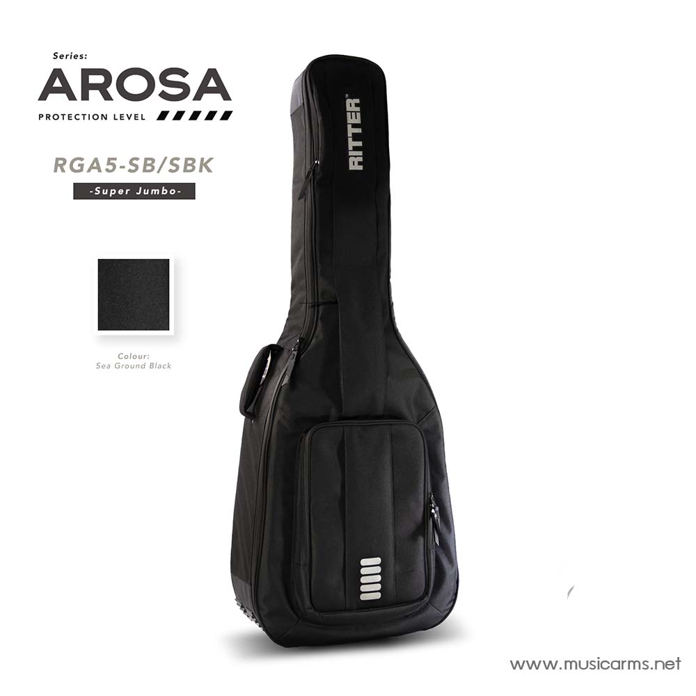 Ritter RGA5-SB กระเป๋าสำหรับกีตาร์โปร่งทรง Super Jumbo ออกแบบมาได้พอดีกับกีตาร์ทุกยี่ห้อ โดยภายในจะเป็น โฟมความหนาแน่นสูง 20 มม. โฟมนุ่ม 10 มม. และขนนุ่ม 3 มม. รวมหนาถึง 33 มม. คุ้มครองกีตาร์ในทุกจุด ตัวฐานมียางรองกันกระแทก พร้อมบล็อกกันคอกีตาร์เลื่อน มีผ้าคลุมกันฝน ช่วยปกป้องกีตาร์ตัวโปรดในทุกการเดินทาง
