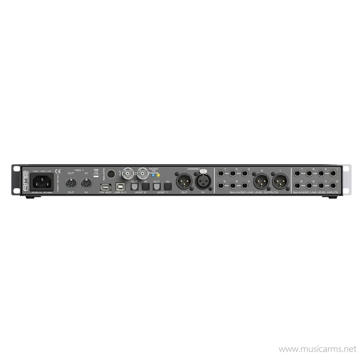 แผงด้านหลังเผยการเชื่อมต่อทั้งหมด Fireface UFX III นอกจาก MIDI I/O อีกชุด ยังมี ADAT I/O แบบออปติคอล 2 ช่อง, AES/EBU I/O, และเอาต์พุตแอนะล็อกบาลานซ์ 8 ช่อง พร้อมเอาต์พุตมอนิเตอร์สเตอริโอ XLR ในโหมด Multi-Mode ADAT I/O ทั้ง 2 ช่องสามารถใช้งานเป็น SPDIF แยกทางออปติคอลได้ นอกจากนี้ยังมีอินเตอร์เฟส MADI แบบออปติคอล (SC) รองรับ 64 ช่องแบบสองทิศทาง และ Word Clock (BNC) สามารถใช้งานเป็น MADI โคแอกเชียลได้หากต้องการ