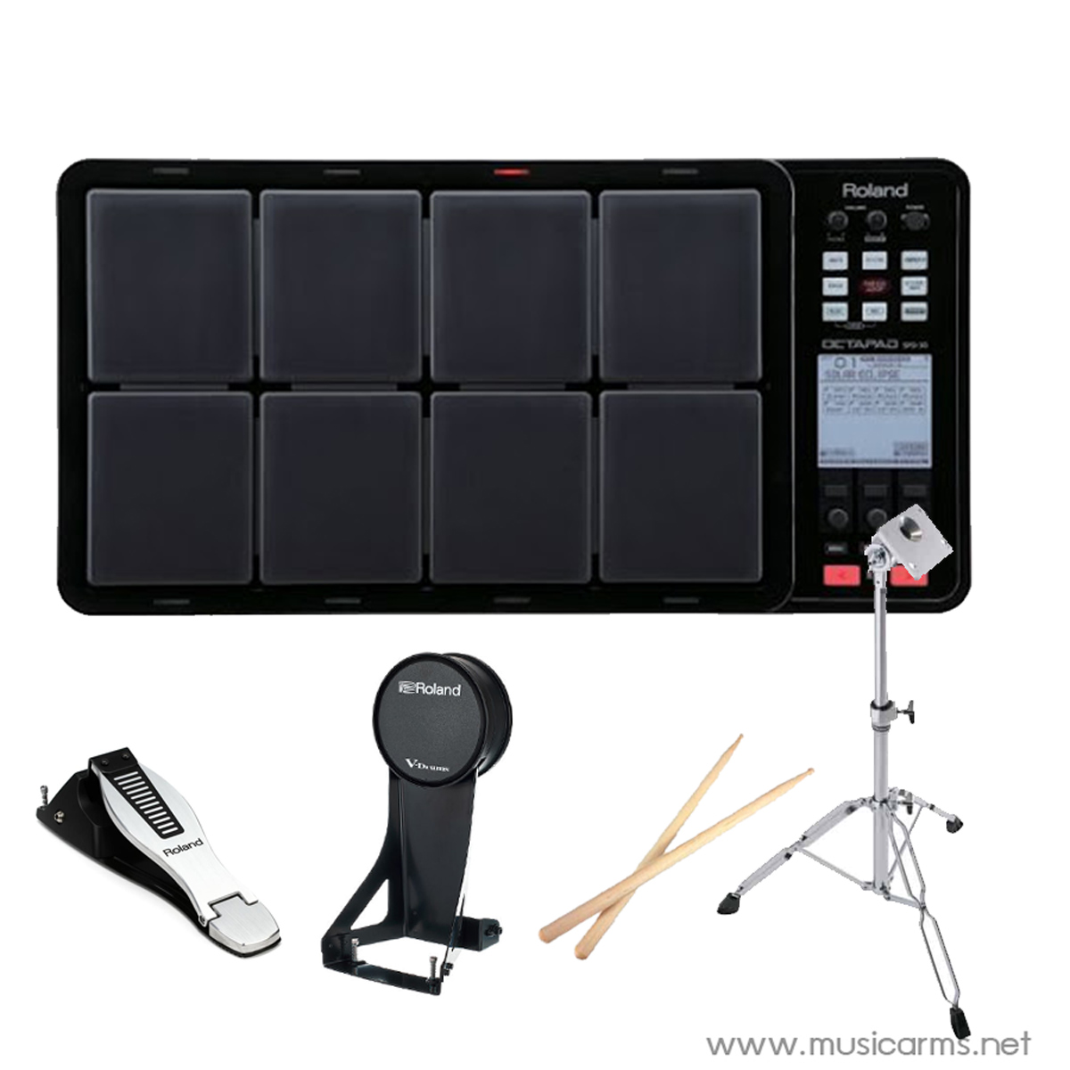 Roland SPD-30 Octapad กลองไฟฟ้าแบบแพดสุดคูลจำนวน 8 แป้น ใช้งานได้ง่ายและสามารถพ่วงต่อกับอุปกรณ์กลองไฟฟ้าอื่นๆได้ด้วย ช่องต่อ Input มากถึง 6 ช่อง ไม่ว่าจะเป็นไฮแฮทหรือกระเดื่องก็สามารถต่อได้หากต้องการความสมจริง ซาวด์ในตัวมากถึง 670 แบบ ทำจังหวะได้ 50 จังหวะ ต่อเข้าคอมพิวเตอร์ง่ายๆด้วย USB ทั้งแบบ A และ B งานนี้ไม่ว่าจะทำเพลง, ซ้อมส่วนตัว หรือจะอัดคลิปเก๋ๆลงยูทูปกับเพื่อนร่วมวงก็ไม่ต้องกังวลกับความเทอะทะ เครื่องเดียวจัดให้ได้สบายๆ