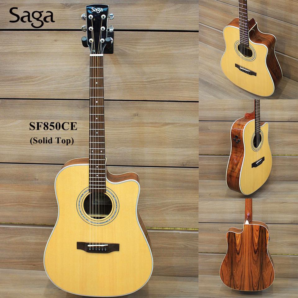 Saga SF850CE กีต้าร์ท็อปโซลิดในราคาจับต้องได้ รุ่นนี้เป็นทรงเดรทน็อตแบบคอเว้า เล่นง่ายโซโล่สะดวก ไม้หน้าเป็นท็อปโซลิดซิทก้าสปรู๊ซ เสียงโทนกลางใสโดดเด่น ด้านข้างและหลังใช้ไม้หายากอย่างบราซิลเลี่ยนโณสวู้ดเป็นส่วนประกอบ ตกแต่งลายกีต้าร์สวยงามด้วยขอบ ABS สีขาว และลายซาวด์โฮลรูปเปลือกหอย ภาคไฟฟ้าขแง Saga เอง ให้เสียงอะคูสตอกใสเป็นธรรมชาติ สามารถปรับ EQ ได้ตามความชอบ ลายไม้สวยงามโดดเด่น จนเห็นแล้วต้องหลงรัก