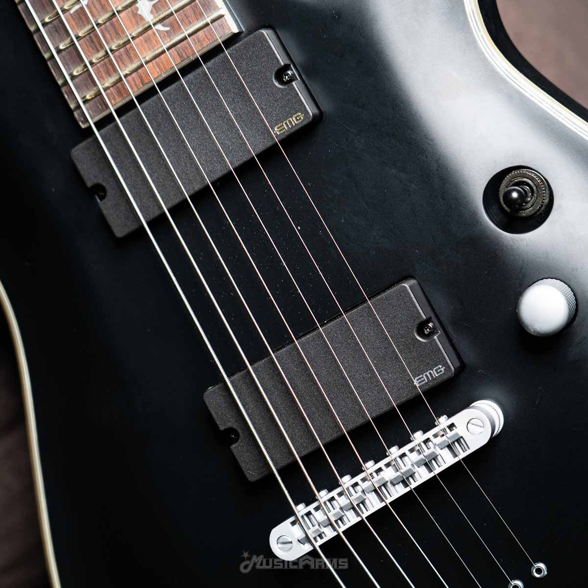 Schecter Damien Platinum 7 กีต้าร์ 7 สาย สำหรับสายร็อคไปจนถึงเมทัล กับงานผลิตได้มาตรฐานสูง บอดี้เป็นไม้มะฮอกกานีเสียงแน่นๆ ปะหน้าด้วยไม้อาร์ช เพิ่มมิติเสียง คอทำจากไม้เมเปิ้ล 3 ชิ้น ให้ซาวด์เสียงกลางดีและแข็งแรง ปิ๊กอัพรับประกันความแรงกับ EMG 81-7 และ 85-7 ซึ่งชาวร็อคชื่นชอบและเป็นแบบ Active เสียงพุ่งหนักๆและเป็นปิ๊กอัพที่ทำมารองรับกีต้าร์ 7 สายได้ดี 24 เฟรตแบบ X จัมโบ้ จะอัดคอร์ดหรือโซโล่ก็ลงตัว ินเลย์ลายค้างคาวเฉียบๆไม่เหมือนใคร แค่เห็นก็ต้องหลงรักแล้ว