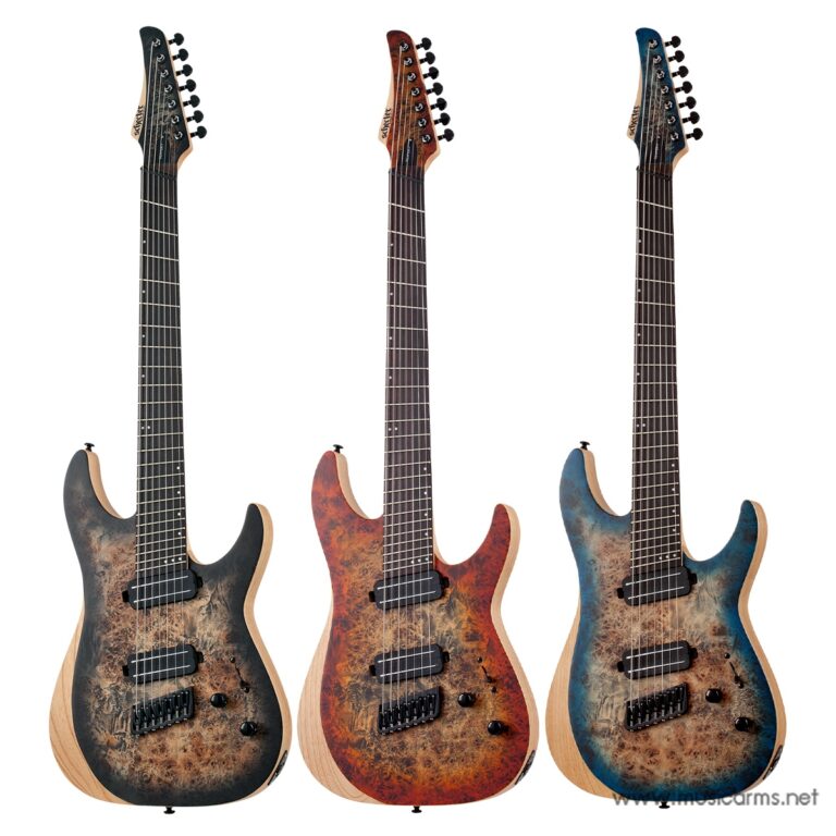 Schecter Reaper-7 Multiscale กีต้าร์ 7 สายในรูปแบบมัลติสเกล ซึ่งเหมาะกับสายร็อคไปจนถึงระดับเมทัล บอดี้นั้นทำจากไม้สแวมแอช ให้เสียงกลางโดดเด่น ปะหน้าด้วยไม้เบิร์ล ลายไม้สวยงามตามคอนเซ็ปต์ของรุ่นที่จะให้ความรู้สึกดุดันทั้งคาแร็คเตอร์เสียงและงานดีไซด์ คอทำจากไม้เมเปิ้ลและวอลนัทประกบคาร์บอนไฟเบอร์แข็งแรงทนทาน ปิ๊กอัพสองตำแหน่งเป็นรุ่น Schecter Diamond Decimator เสียงหนาสะใจชาวร็อค และสามารถตัดคอยล์ได้ ใครหากีต้าร์ 7 สายสวยๆ จัดไปให้ไว