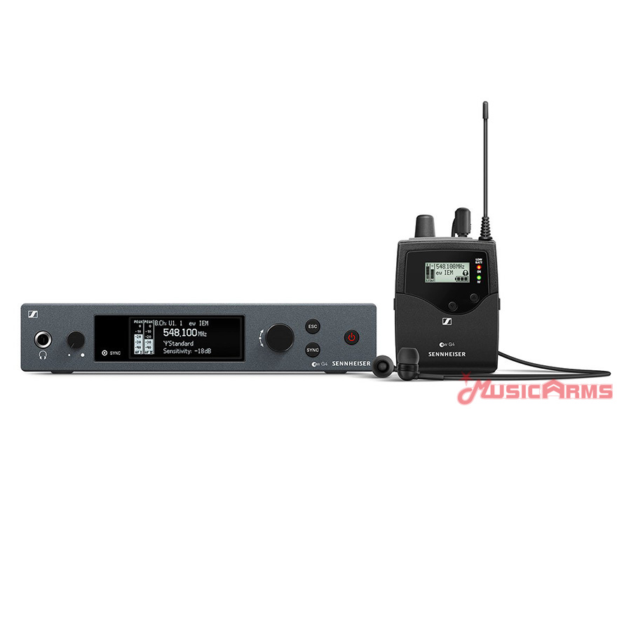 - Consists of UHF bodypack receiver (EK IEM G4), 9.5″ transmitter (SR IEM G4) and IE4 earphones