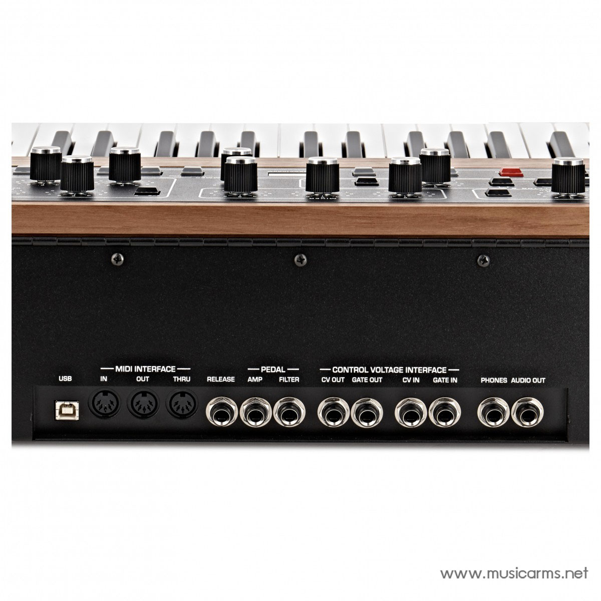 - Gate in/out (1 x แจ็คโทรศัพท์ 1/4”) รองรับสัญญาณเปิด/ปิด 1.5 ถึง 15 โวลต์เพื่อเปิด/ปิดเอนเวโลปของเสียงเดียวใน Prophet-5 และส่งออกสัญญาณเปิด/ปิด 15 โวลต์ที่ใช้ในการเปิด/ปิดเอนเวโลปของซินธ์ภายนอก