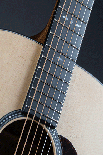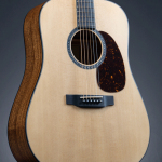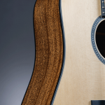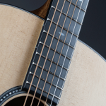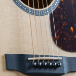 The neck is a dovetail joint – a classic construction method that allows for excellent transfer of energy between the body and neck. The neck is made of mahogany and is a low profile – designed to feel comfortable for people who don’t like a chunkier neck or find them cumbersome to play on. The fingerboard (and bridge) are Micarta – this gives an awesome dark look akin to ebony and really helps this series look fantastic and classy. The scale length is 25.4″ (645mm) – which is in the standard acoustic range – and the neck width at the nut is 1-3/4″ (44.5mm). The nut and saddle are made of bone. The material chosen for the nut and saddle really does make a difference. In this case, bone is a classic choice and will function well in the all important transfer of the energy of the strings to the body of the guitar.