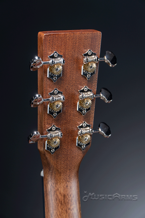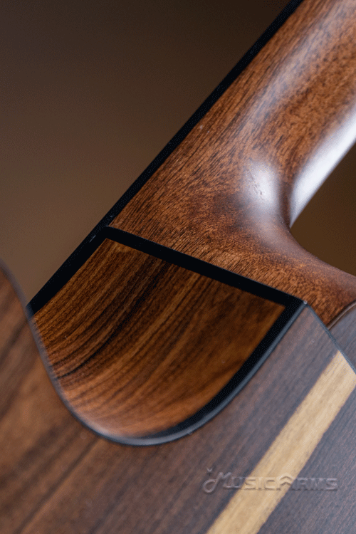 The neck is a dovetail joint – a classic construction method that allows for excellent transfer of energy between the body and neck. The neck is made of mahogany and is a low profile – designed to feel comfortable for people who don’t like a chunkier neck or find them cumbersome to play on. The fingerboard (and bridge) are Micarta – this gives an awesome dark look akin to ebony and really helps this series look fantastic and classy. The scale length is 25.4″ (645mm) – which is in the standard acoustic range – and the neck width at the nut is 1-3/4″ (44.5mm). The nut and saddle are made of bone. The material chosen for the nut and saddle really does make a difference. In this case, bone is a classic choice and will function well in the all important transfer of the energy of the strings to the body of the guitar.