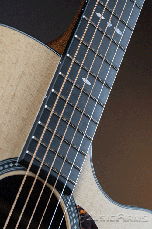 The neck is a dovetail joint – a classic construction method that allows for excellent transfer of energy between the body and neck.  The neck is made of mahogany and is a low profile – designed to feel comfortable for people who don’t like a chunkier neck or find them cumbersome to play on.  The fingerboard (and bridge) are Micarta – this gives an awesome dark look akin to ebony and really helps this series look fantastic and classy.  The scale length is 25.4″ (645mm) – which is in the standard acoustic range – and the neck width at the nut is 1-3/4″ (44.5mm).  The nut and saddle are made of bone.  The material chosen for the nut and saddle really does make a difference.  In this case, bone is a classic choice and will function well in the all important transfer of the energy of the strings to the body of the guitar.