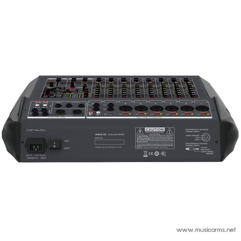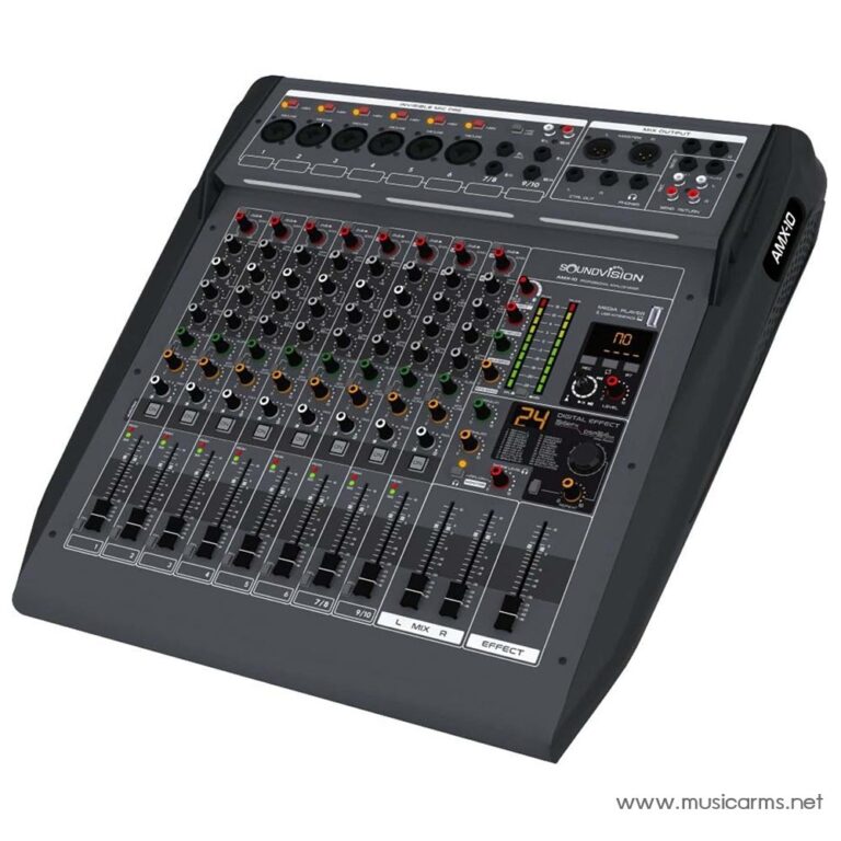 Soundvision AMX-10 เป็นมิกเซอร์อนาล็อก น้องเล็กสุดในซีรีส์ AMX จากแบรนด์ Soundvision มาพร้อม 10 ชาแนล ประกอบไปด้วย 6 แชนแนล สำหรับ Mono inputs และ 2 แชนแนล สำหรับ Stereo inputs โดยช่องอินพุตโมโนแต่ละช่องมี 3-bands EQ (1-bands สำหรับ swept mids) ในส่วนช่องอินพุตเตอริโอแต่ช่องจะมี 4-bands EQ มาพร้อมปรีไมค์ Ultra-low noise invisible และ +48V phantom power ที่แยกกันในแต่ละชาแนล นอกจากนี้ยังมี PFL/PEAK LED, เฟดเดอร์ 60 มม. สำหรับแต่ละชาแนล, USB audio interface 2-in / 2-out และโปรเซสเซอร์ DSP 24-bit เหมาะสำหรับ คอนเสิร์ต ห้องประชุม โบสถ์หรือศาสนสถาน