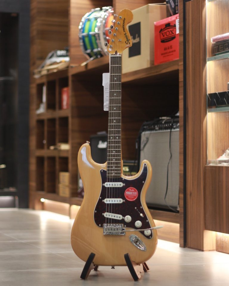 Squier Classic Vibe Stratocaster 70s HSS เป็นอีกรุ่นที่น่าจับตามองที่ทำให้ใครหลายคนนั้นบาดตาอยากจะเป็นเจ้าของเพราะมันออกแบบมาให้ดูคลาสสิคตามทรงกีต้าร์ยุค 70′ วัสดุที่ได้ตามมาตรฐานคล้ายคลึง Fender บอดี้ไม้ป็อปลาร์เสียงกลางเด้งๆ คอเมเปิ้ลฟิงเกอร์บอร์ดอินเดียนลอเรล ตัวกีต้าร์เพิ่มความสวยงามด้วยการเคลือบเงาด้วยโพลีเอสเตอร์ เสริมด้วยปิ๊กการ์ดที่ทำจากพลาสติก 4 ชั้นช่วยให้โดดเด่นมากขึ้น ปิ๊กอัพวางสไตล์ HSS เล่นได้หลากหลายแนวเพลง ซีเล็คเตอร์ 5 ทางตอบโจทย์ดนตรีทุกแนว รุ่นนี้ยังสามารถเสียบคันโยกได้อีกด้วย ฟังค์ชั่นครบครันมากับสไตล์วินเทจเก๋ๆน่าจะถูกใจมือกีต้าร์มากมาย