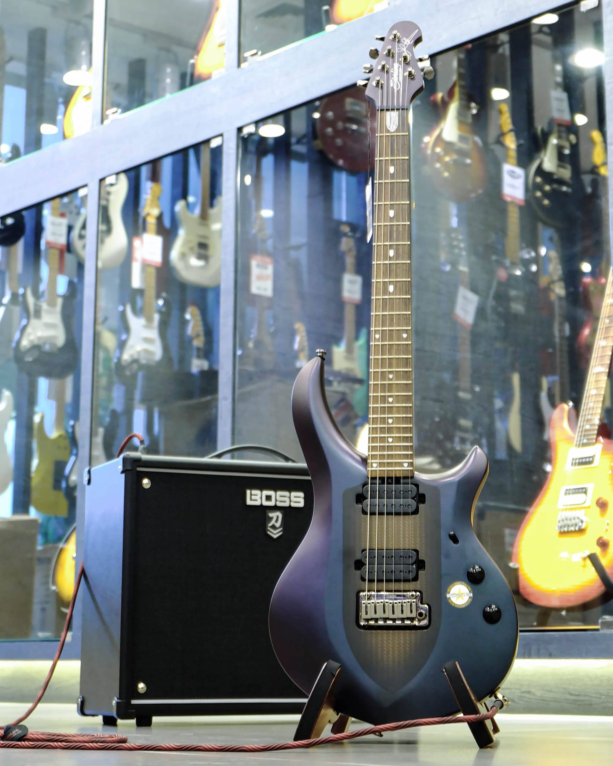 Sterling JP MAJESTY MAJ-100 กีต้าร์ซิกเนเจอร์ John Petruzzi คนดังแห่ง Dream Theater ซึ่งได้พัฒนามาอย่างต่อเนื่อง รุ่นนี้จะมี 24 เฟรต โซโล่กันได้มันส์สะใจ ตัวปิ๊กอัพนั้นเป็นของทาง Music Man Humbucker รับประกัยเสียงดุ หนา พุ่งแรง ได้เป็นอย่างดี และยังตอบโจทย์มือกีต้าร์ที่ต้องการซาวด์อันหลากหลายด้วยการมีปุ่มตัดคอยล์ไว้ให้ด้วย บอดี้ไม้แอฟริกันมะฮอกกานี ให้เสียงหนาแน่นๆเล่นแนวเมทัลได้สบายๆ คอไม้เมเปิ้ลอบ เสียงเนียนทำทรงคอให้บางเล่นง่าย พิเศษด้วยบริดจ์แบบ Double Locking ใส่คันโยกได้ ล็อคสายแน่นไม่เพี้ยนง่าย สาวก John Petruzzi ไม่น่าพลาดด้วยประการทั้งปวง