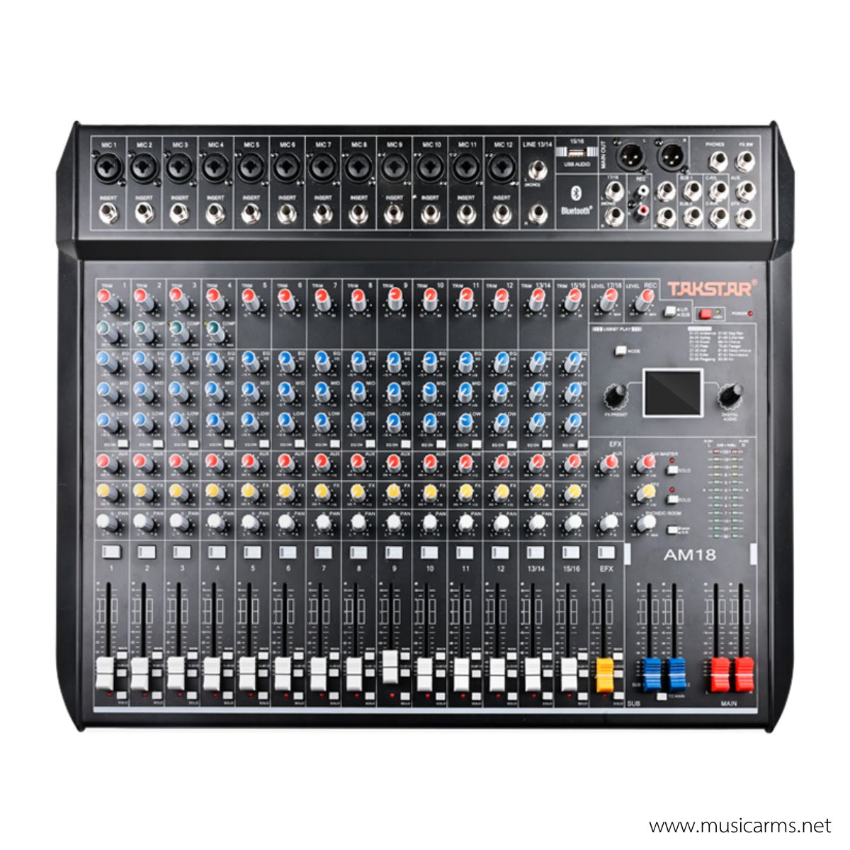 Takstar AM18 เป็นอนาล็อกมิกเซอร์ (Analog Mixer) รุ่นใหญ่ในตระกูล AM Series ที่ออกแบบมาเพื่อรองรับการใช้งานที่หลากหลาย ตั้งแต่การทำโฮมสตูดิโอ งานบันทึกเสียง จนถึงงานอีเวนต์ขนาดกลาง โดยมีจุดเด่นอยู่ที่จำนวนช่องสัญญาณ (Input) ที่มากถึง 18 ช่อง และมีฟีเจอร์สมัยใหม่อย่าง Bluetooth และ USB Interface ในตัว